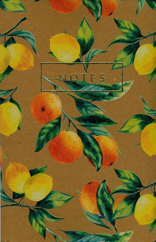 Okładka notesu z ilustracją owoców cytrusowych oraz tłoczony na złoto napis tworzą piękne zestawienie z naturalną tekturą.