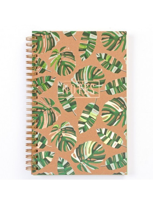 Bogato zdobiony notes na spirali z tłoczoną okładką. Ilustracja okładkowa inspirowana monsterą dziurawą. Ekologiczny notatnik wykonany z tektury w 100% z odzysku. Notes w linie, oprawiony złotą spiralą. Wykończony zieloną wyklejką.