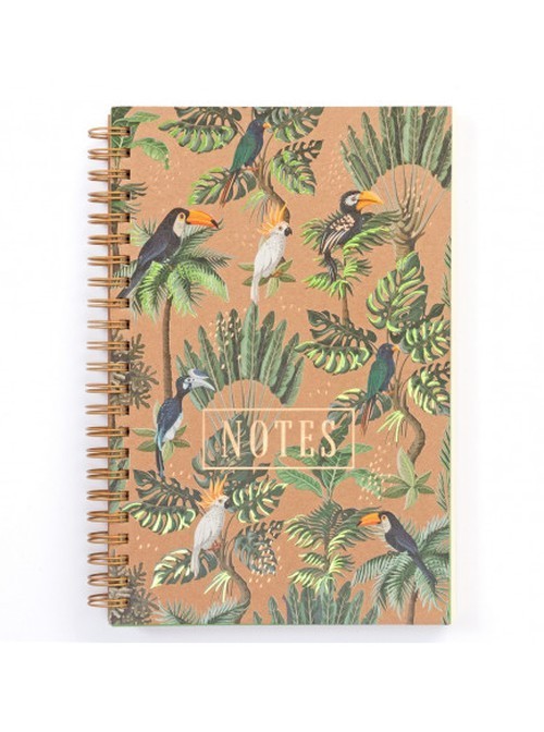 Bogato zdobiony notes na spirali z tłoczoną okładką. Ilustracja okładkowa inspirowana lasem tropikalnym. Ekologiczny notatnik wykonany z tektury w 100% z odzysku. Notes gładki, oprawiony złotą spiralą. Wykończony zieloną wyklejką.
