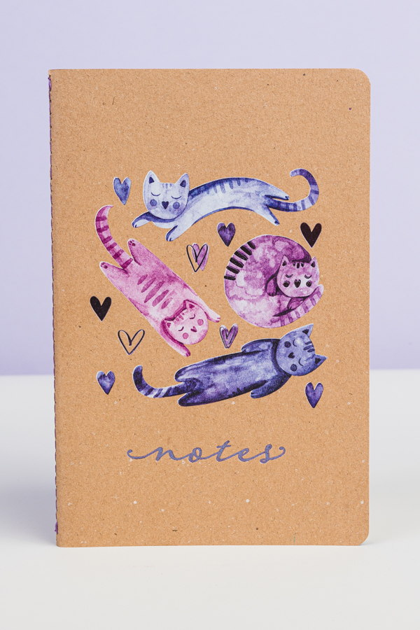 Okładki notesu z ilustracją kotów i serduszek oraz subtelnie tłoczone elementy grafiki i napisy, tworzą piękne zestawienie z naturalną tekturą. Kolor nici, pierwszej i ostatniej strony notesu uzupełniają stylowy wygląd notesu.