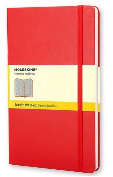 Notes marki Moleskine Classic w rozmiarze L (13x21cm) w kratkę. Zamykany na gumkę. Okładka twarda w kolorze czerwonym.