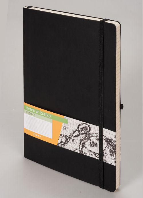2. Oprawa miękka, ekologiczna z materiału skóropodobnego 3. Format B5 4. 80g papier w kolorze chamois 5. Pierwsza i ostatni strona notesu wykończona ozdobnym papierem w kolorze czarnym 6. Posiadają specjalną gumkę na długopis w kolorze okładki 7. Specjalna koperta na karteczki w kolorze czarnym 8. Notes zamykany jest na sprytną gumkę x