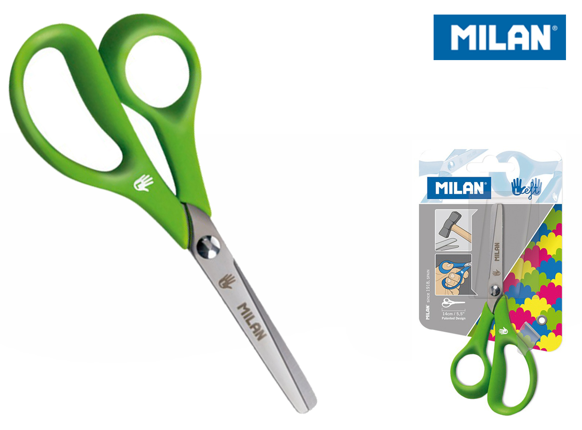 Nożyczki dla osób leworęcznych z przestawionym ostrzem ze stali nierdzewnej. Długość 14 cm. Ostrza zaokrąglone na końcach. Ergonomiczny plastikowy uchwyt. Różne kolory.