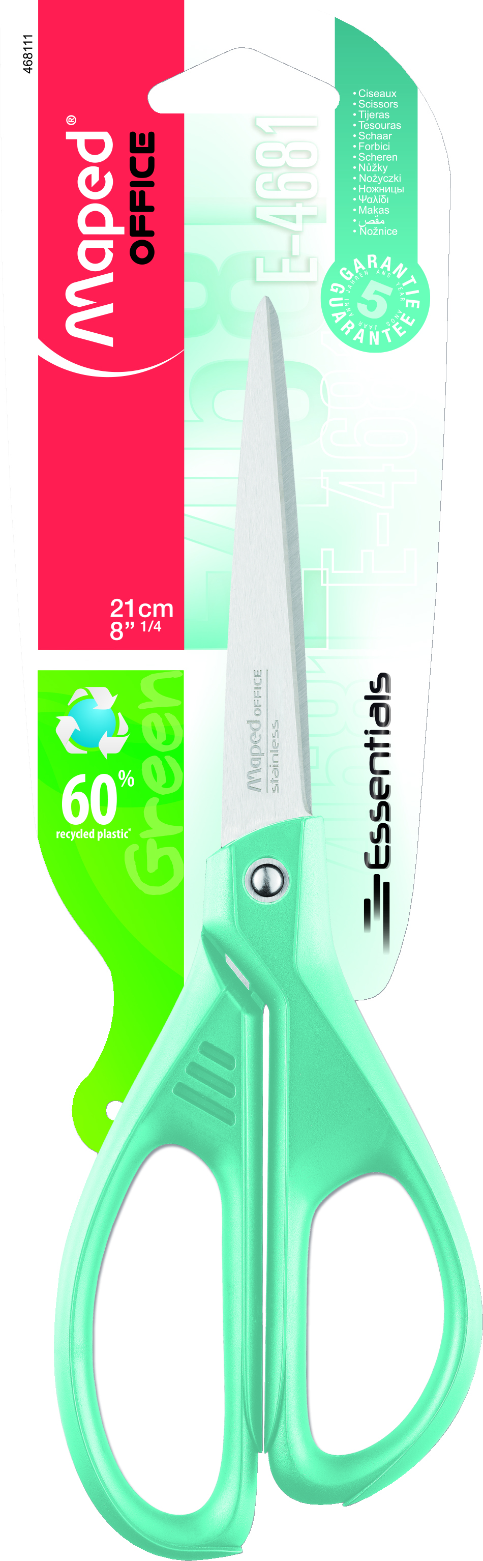 Nożyczki ekologiczne Essentials Green. Uchwyty w kolorze pastelowym turkusowym w 60% wykonane z surowców pochodzących z recyklingu. Ostrza i nit ze stali nierdzewnej gwarantują długotrwałe użytkowanie. Asymetryczny uchwyt, długość ostrzy: 21 cm. Dostępne również w wersji o długości 17cm z symetrycznym uchwytem. Gwarancja 5 lat.