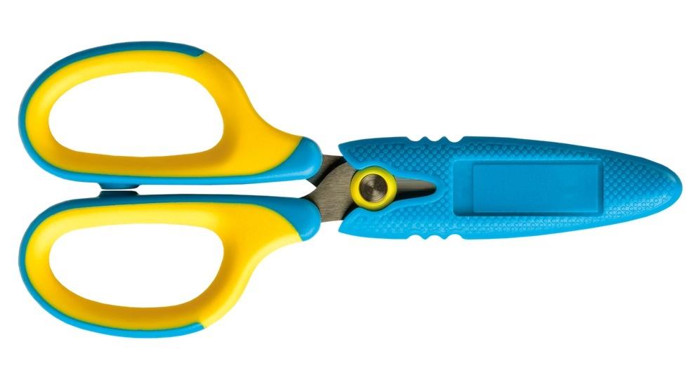 Opis produktuZasady bezpieczeństwaNożyczki szkolne wykonane ze stali nierdzewnej z zaokrąglonymi końcówkami. Wyposażone w antypoślizgowy uchwyt oraz osłonę na ostrza z miejscem na podpis. Rozmiar 5 1/4". Kolor żółto - niebieski. x