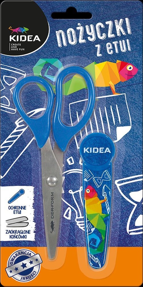 Nożyczki z etui ochronnym, łatwotnące, zaokrąglone końcówki, ze stali nierdzewnej. Seria Kidea.