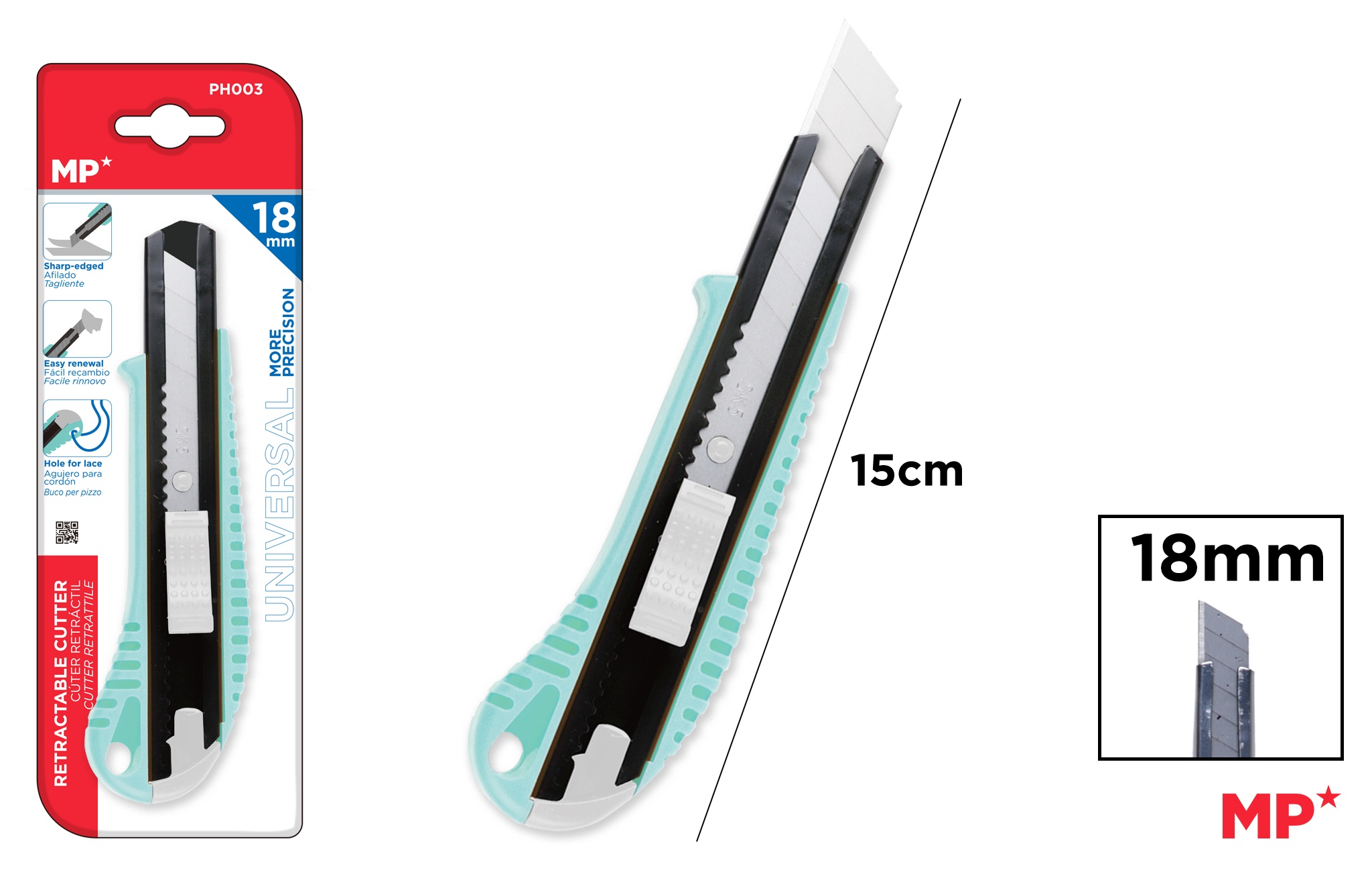 Opis produktuZasady bezpieczeństwaSzeroki plastikowy nóż. Chowany, aby przechowywać ostrze i uniknąć przecięć i przekłuć.Z wymiennymi, wstępnie przyciętymi ostrzami ze stali nierdzewnej o szerokości 18 mm. Posiada hamulec bezpieczeństwa. Ochronna metalowa prowadnica ostrza. Z otworem do zawieszenia. Długość:150 mm. Blister 1 sztuki. x