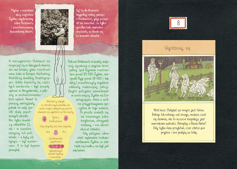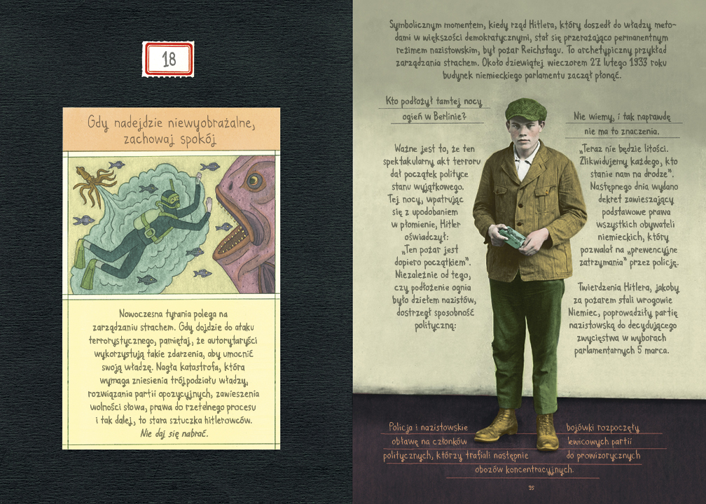 JEDNA Z NAJWAŻNIEJSZYCH KSIĄŻEK OSTATNICH LAT W WYDANIU GRAFICZNYM Historia się nie powtarza, ale udziela lekcji. Timothy Snyder wraca do najmroczniejszych momentów XX wieku i daje 20 rad, jak stawiać opór rządom tyranów oraz dbać o wolność i prawdę. Mówi, co zrobić, żeby przyszłość była wolna od totalitaryzmu. WYRÓŻNIAJ SIĘ. Podążać za innymi jest łatwo. Robiąc lub mówiąc coś innego niż większość, możesz czuć się dziwnie, ale to uczucie niepokoju jest warunkiem wolności. BĄDŹ DOCIEKLIWY. Sprawdzaj informacje samodzielnie. Weź odpowiedzialność za wiadomości, które przekazujesz innym. NIE DAJ SIĘ NABRAĆ. Nie pozwól wykorzystywać wiedzy o sobie, aby nie być podatnym na presję. Unikaj fraz, które słyszysz od wszystkich innych. NIE BĄDŹ Z GÓRY POSŁUSZNY  NAJLEPSZA POWIEŚĆ GRAFICZNA 2021 WEDŁUG „NEW YORK TIMESA” NOWOCZESNA LEKCJA HISTORII PRZEŁOMOWA KSIĄŻKA O TYM, JAK PRZECIWSTAWIAĆ SIĘ AUTORYTARYZMOWI  TIMOTHY SNYDER to wybitny intelektualista amerykański i jeden z najważniejszych historyków XXI wieku. Znawca Europy Wschodniej i II wojny światowej. Jest profesorem historii w Katedrze im. Richarda C. Levina na Uniwersytecie Yale i stałym członkiem Instytutu Nauk o Człowieku w Wiedniu. Napisał piętnaście książek, które ukazały się w ponad czterdziestu językach. Za swoje dzieła otrzymał liczne nagrody i wyróżnienia: Nagrodę im. Hannah Arendt, przyznawaną w Lipsku Nagrodę na rzecz Europejskiego Porozumienia, Nagrodę Literacką Amerykańskiej Akademii Sztuk i Nauk, nagrodę Holenderskiego Komitetu Oświęcimskiego, medal „Powstanie w Getcie Warszawskim” oraz inne wyróżnienia. Jego twórczość stała się inspiracją dla obrazów, plakatów, rzeźb, sztuk teatralnych, filmów, utworów punkrockowych i rapowych oraz opery. Lekcje pochodzące z tej książki są cytowane podczas demonstracji w obronie wolności na całym świecie. Mieszka w New Haven w stanie Connecticut. NORA KRUG to ceniona niemiecko-amerykańska autorka i ilustratorka. Jest autorką książki Belonging. A German Reckons with History and Home [Przynależność. Niemka rozlicza się z historią i ojczyzną], która w 2018 roku otrzymała nagrodę National Book Critics Circle i została uznana za książkę roku „New York Timesa”. Jej prace były nagradzane przez Society of Illustrators i NY Art Directors Club; zostały także wybrane do serii „Best American” wydawnictwa Houghton Mifflin i były prezentowane podczas festiwalu filmowego w Sundance. Krug otrzymała stypendia Fulbrighta i Guggenheima oraz została uznana za Ilustratorkę Roku 2019 przez londyńskie Muzeum Wiktorii i Alberta. Prowadzi wykłady dotyczące ilustracji w nowojorskiej Parsons School of Design.