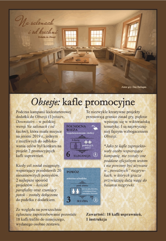 Opis produktuZasady bezpieczeństwaNa salonach i od kuchni: kafle promocyjne Podczas kampanii kickstarterowej dodatku do Obsesji Na salonach i od kuchni (eng. Upstairs, Downstairs), która miała miejsce jesienią 2019 r., jednym z możliwych do odblokowania celów był konkurs na projekt 2 promocyjnych kafli usprawnień. Kiedy cel został osiągnięty, wspierający przedstawili 20 niesamowitych pomysłów. 2 najlepsze spośród nich kościół parafialny oraz szumiący potok zostały dołączone do pudełka z dodatkiem (NSIOK). Ze względu na powszechnie zgłaszane zapotrzebowanie, pozostałe18 kafli trafiło do niniejszego, wydanego osobno zestawu. Te niezwykle kreatywne projekty przesuwają granice zasad gry, pięknie wpisując się w wiktoriańską tematykę. I są najzwyczajniej fajnym wzbogaceniem Obsesji!