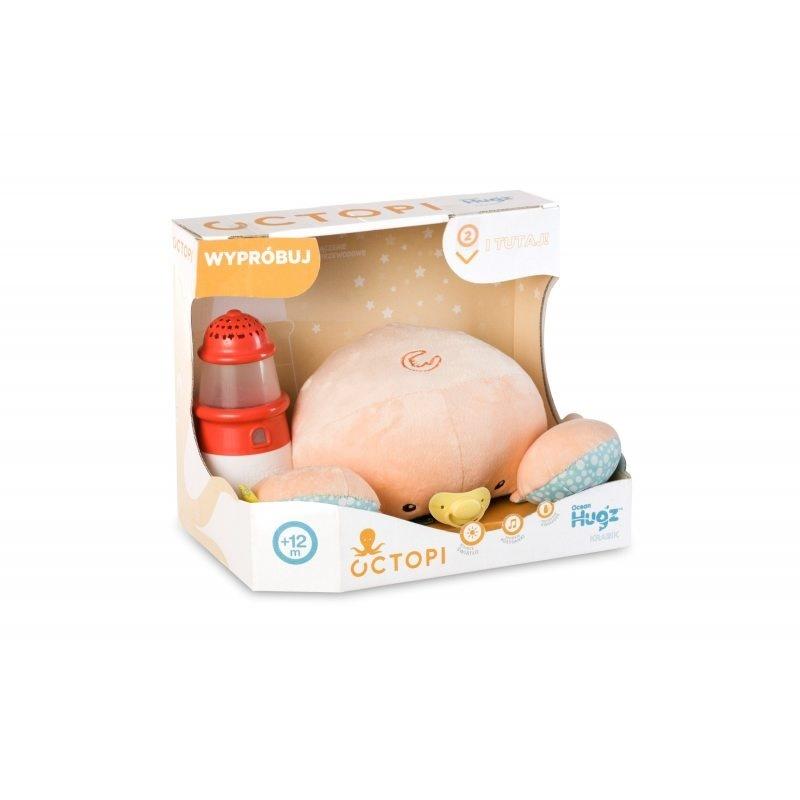 Ocean Hugz - Maskotka Wielorybek i Projektor Latarnia Morska DKM6869. Gdy przytulisz pluszaka, latarnia morska zaczyna grać kołysanki i świecić. Możliwe jest również włączenie samej latarni morskiej, bez konieczności przytulania pluszaka. Latarnia Morska gra kołysanki, świeci delikatnym światłem i wyświetla gwiazdki na suficie. Posiada okrągłą podstawę, dzięki której może się delikatnie kołysać. Ośmiorniczka w kolorze fioletowym posiada żółty, plastikowy smoczek. Latarnia rozświetli pokój i ukołysze Twoje dziecko do snu.