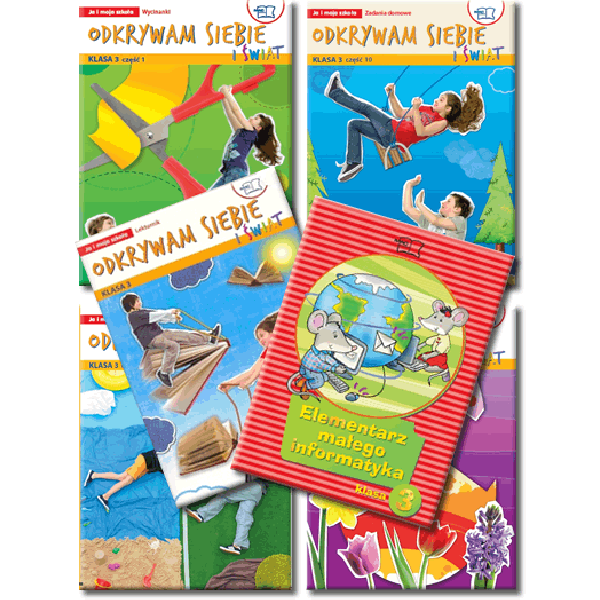 Odkrywam siebie i świat. Ja i moja szkoła to pakiet podręczników i pomocy szkolnych dla klasy trzeciej. Cykl jest całkowicie zgodny z obowiązującą podstawą programową. Został napisany przez pedagogów z wieloletnim stażem - Jolantę Faliszewską oraz Grażynę Lech. W skład pakietu wchodzą: Książki dla ucznia (części 1-10) Zawierają tematykę związaną z kształtowaniem osobowości dziecka, jego świata wartości, tożsamości osobistej i społecznej, zasad współżycia, poszanowania godności swojej i innych ludzi. Podzielone są na 10 części, po jednej na każdy miesiąc nauki, co sprawia, że dziecko na co dzień ma lekki tornister. Zeszyty do zadań domowych (części 1-10) Zawierają ćwiczenia utrwalające wiadomości i umiejętności zdobyte w szkole, na końcu zeszytów zamieszczono teksty do czytania przez rodziców i dla rodziców. Wycinanki (części 1-2) Zawierają pomoce dydaktyczne do wykorzystania przez dzieci podczas zajęć oraz rozmaite zabawki i gry. Zabawki są wykorzystywane podczas zajęć matematycznych, przyrodniczych, społecznych i językowych. Lekturnik Karty pracy - Wielkanoc Elementarz małego informatyka (z płytą CD) Przeznaczony dla dzieci, które rozpoczynają przygodę z komputerem. Zawiera podstawowe informacje teoretyczne oraz ćwiczenia, które rozwijają umiejętności zdobyte podczas zajęć.