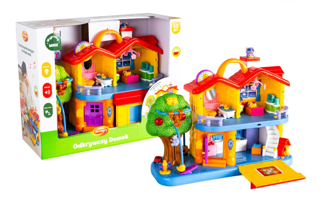 Zabawka, która umożliwi każdemu maluchowi poznanie zwyczajów panujących w domu. Domek jest pełen ciekawych niespodzianek, ekscytujących światełek oraz wypełniony dźwiękami i rymowankami prawie w każdym miejscu. Maluch naciskając na przedmioty i urządzenia znajdujące się w domku, usłyszy ich realistyczny dźwięk, między innymi odgłos skrzypiących drzwi, naturalne dźwięki telefonu, kuchenki czy pralki. Dodatkową radość sprawi dziecku możliwość przełączenia zabawki z dźwięków na wesołe rymowanki. Pociecha naciskając wtedy na dany przedmiot, który wydawał realistyczny odgłos, usłyszy zabawną rymowankę. Każda z funkcji domu to kreatywna zabawa, która pobudzi twórczość dziecka. Zabawka wspomaga naukę codziennych czynności domowych, jak również uczy logicznego myślenia.