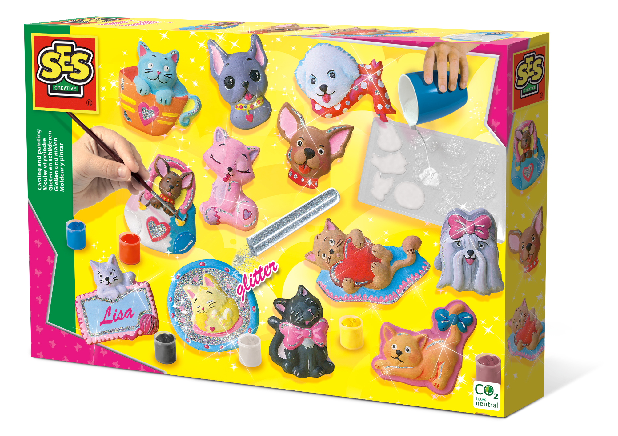 Zestaw zawiera dużą foremkę do odlewu figurek piesków i kotków, farbę w 6 kolorach, pędzel, brokat i gips.