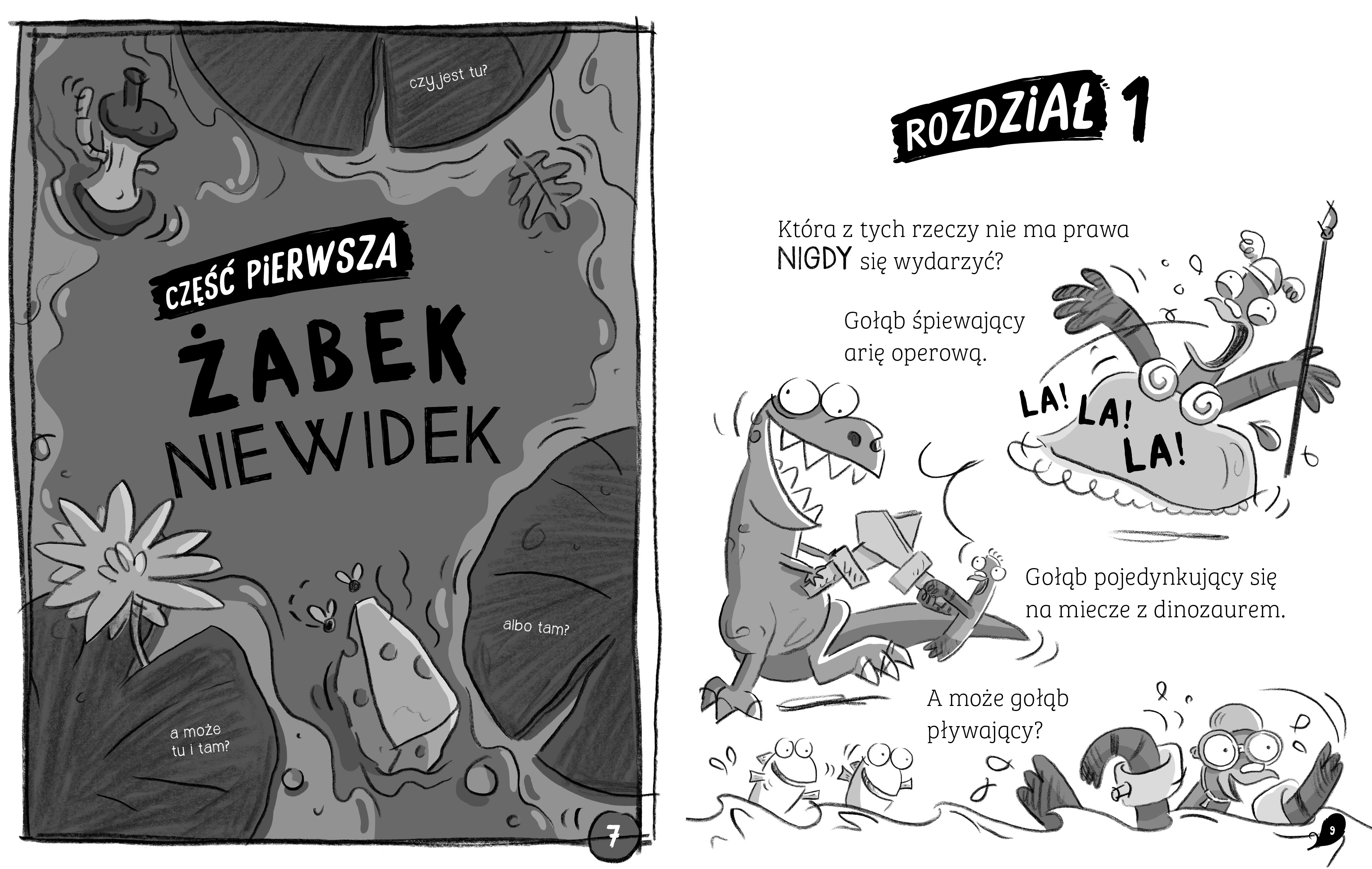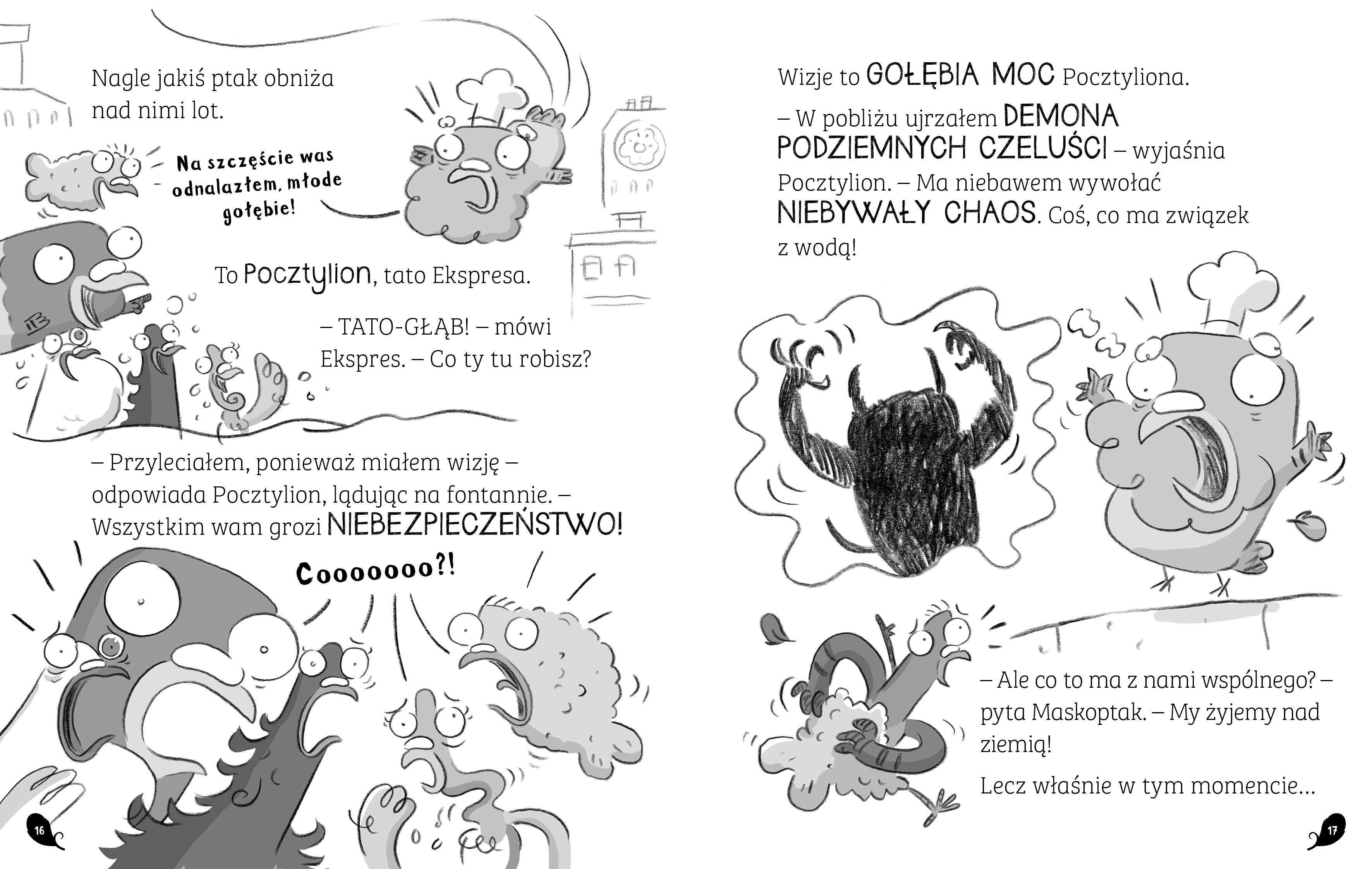 Opis produktuZasady bezpieczeństwaOchrona miasta to brudna robota. Drużyna ODLOTOWYCH GOŁĘBI uwielbia taplać się w parkowej fontannie. Do czasu! Nadchodzi DEMON PODZIEMNYCH CZELUŚCI, który wywoła NIEBYWAŁY CHAOS. Znika woda. I to WSZĘDZIE! Aby zapobiec najgorszemu, odważne ptasiory dają nura do kanałów. Czy ŻABKA NIEWIDKA i drużyna KUMATYCH ŻAB zdetronizują załogę ODLOTOWYCH GOŁĘBI? Poznaj swoich nowych kumpli, oto ODLOTOWE GOŁĘBIE: EKSPRES żyje na krawędzi, złoczyńców zjada na śniadanie, rozwiązuje najtrudniejsze zagadki, a co najważniejsze - ratuje wasze tyłki przed najgorszym. Wroną Wielkodziobą, porywaczami i Megagackiem, a nawet śmierdzącą bombą na festynie food trucków. MASKOPTAK może się stać wroną, nietoperzem, ba!, nawet człowiekiem (albo chociaż jego ręką lub nogą czy coś w tym stylu). Nikt tak nie kocha przebieranek jak świrnięty Maskoptak, który walczy na śmierć i życie o ostatni okruszek. PAPILOTKA supersilna, superodważna i totalnie pokręcona, nie cofnie się przed niczym, nawet będąc krok od katastrofy. Choć bycie w drużynie, to czasami ciężki kawałek chleba, ten lotny ptak poradzi sobie ze wszystkim. WYWROTKA wykręci się z każdej opresji, czasami buja w obłokach, ale podbramkowe sytuacje to jej chleb powszedni, ma na oku cały park i nie da sobie w okruszki dmuchać, a za przyjaciółmi pójdzie w ogień. GRUCHOT nigdy nie chowa głowy w piasek, ale czasami chodzi spać z kurami, nie tak łatwo podciąć mu skrzydła i choć może się wydawać, że walczy z wiatrakami, to podczas każdej brawurowej akcji idzie na całość. Cudownie absurdalna - "Booklist" Szalona kryminalna farsa Młodzi czytelnicy szybko ją rozpracują - "Kirkus Reviews" Idealna dla początkujących czytelników, którzy żądają akcji, przezabawnych porwań i walki z przestępczością - "School Library Journal" x