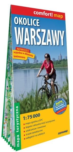 Dwustronnie laminowana, wygodna w składaniu mapa turystyczna okolic Warszawy obejmuje swoim zasięgiem obszar od Serocka na północy, po Tłuszcz i Kołbiel na wschodzie, Górę Kalwarię i Mszczonów na południu oraz Teresin i Kampinos na zachodzie. Publikacja została opracowana we współpracy z doświadczonymi krajoznawcami z regionu.
