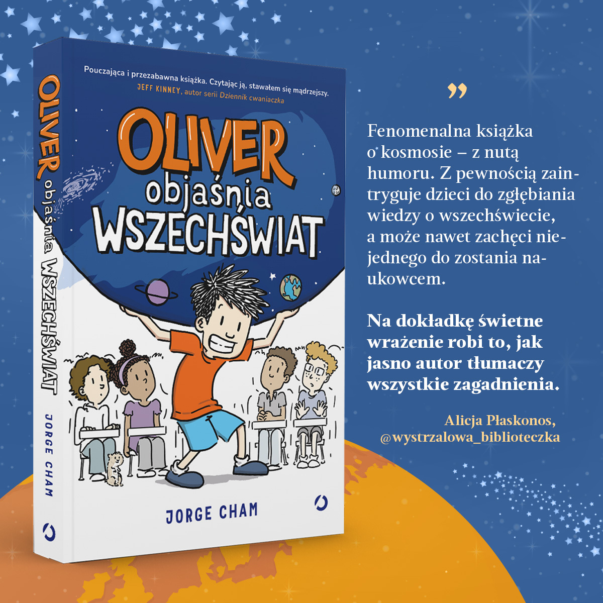 Brzmi kosmicznie prawda? Dzięki fantastycznej książce pt. "Oliver objaśnia wszechświat", którą napisał Jorge Cham, zagadnienia związane z Wielkim Wybuchem, promieniowaniem gamma, czy czarnymi dziurami przestaną być dla Waszych dzieci obce. Na jej kartach poznajemy 11-letniego Olivera. Pewnego dnia klasę, do której uczęszcza chłopiec, odwiedził doktor Howard - naukowiec. Zaciekawiony wszechświatem chłopiec postanawia zgłębić temat i opisać go w swej książce. Kto wie, może zostanie w przyszłości słynnym astrofizykiem, jak Albert Einstein czy Stephen Hawking? Historia przedstawiona przez Olivera jest arcyzabawna, a dzięki licznym, czasem wręcz kuriozalnym porównaniom, skomplikowane pojęcia zapadają w pamięć z łatwością. Co wspólnego ma niewinny bąk z Wielkim Wybuchem? A klopsiki z Układem Słonecznym? Dlaczego czarne dziury można porównać z sedesem? Zaintrygowani? Jeżeli chcecie poznać odpowiedzi na te zaskakujące pytania, koniecznie sięgnijcie po tę nietuzinkową publikację. Zapraszam do lektury! Będzie zabawnie, a zarazem interesująco. Dodatkowo wśród rozlicznych ciekawostek znajdziecie komiksy o planetach, epicką przygodę kosmiczną oraz coś na deser. Bawiłam się doskonale podczas czytania tej książki. Jestem przekonana, że zainteresuje wielu czytelników w wieku szkolnym i przypadnie do gustu fanom znanych serii, takich jak "Dziennik cwaniaczka" czy "Zapiski Luzaka". x