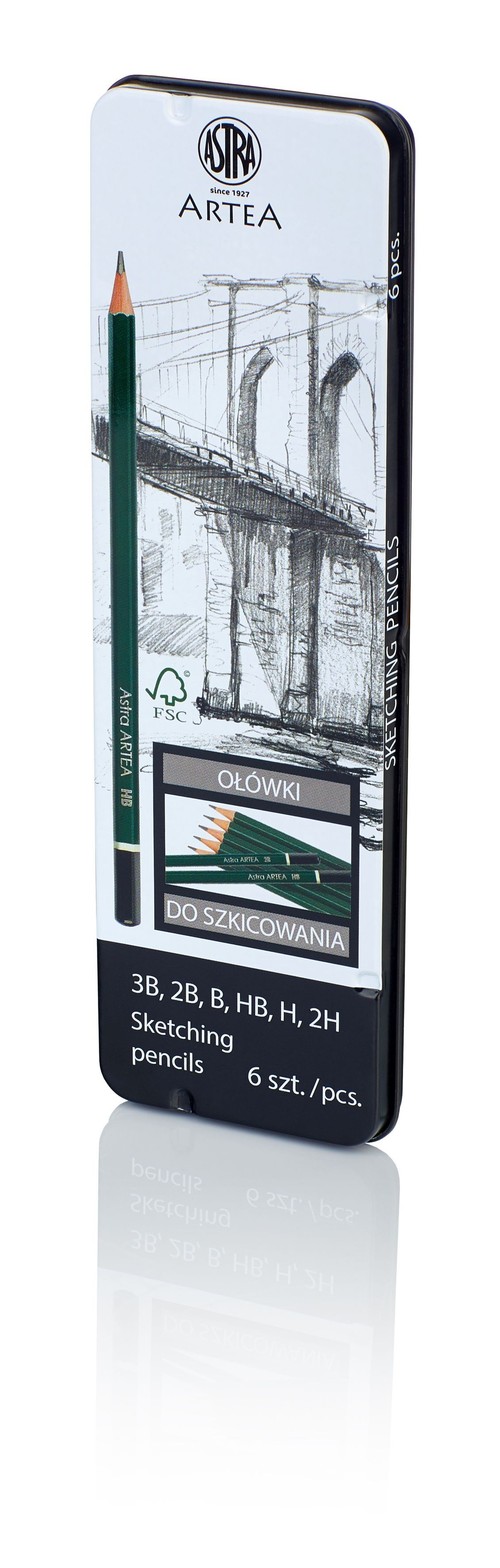 W zestawie ołówki o twardości: 3B, 2B, B, HB, H, 2H. Posiadają certyfikat FSC. Hexagonalny kształt, metalowe pudełko. x