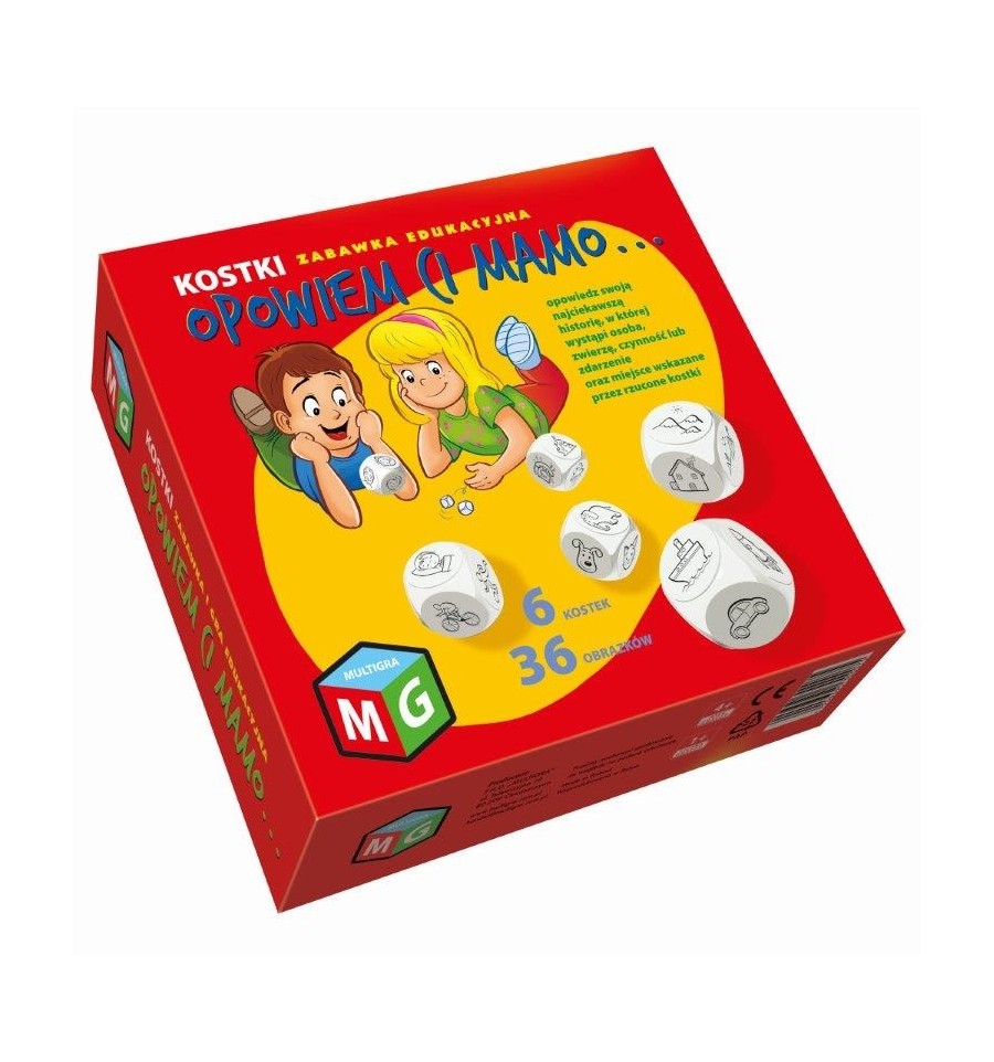 Opis produktuZasady bezpieczeństwaKostki obrazkowe Opowiem Ci mamo to prosta ale bardzo interesująca i wartościowa zabawka i gra edukacyjna. Na 6 kostkach znajdują się symboliczne obrazki przedstawiające osobę, czynność, zdarzenie i miejsce. Zabawa polega na tym, by po rzucie kostkami opowiedzieć historyjkę, która będzie zawierała wszystkie elementy wskazane przez kostki. Zabawa może odbywać się w większym gronie, a każdy z uczestników w swojej kolejce stara się opowiedzieć jak najciekawszą historię. Zabawa stanowi świetną pomoc dydaktyczną, rozwija wyobraźnię, zmusza do myślenia i uczy poprawnego wysławiania się. Zawartość pudełka: