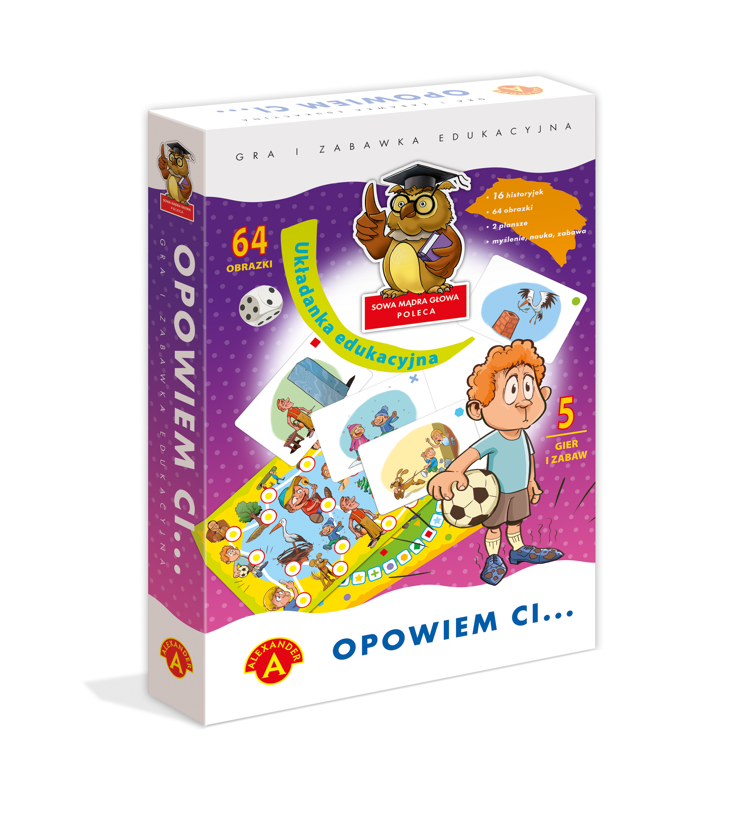 "Opowiem Ci" to świetna zabawa i jednocześnie pomoc dydaktyczna dla dzieci w wieku przedszkolnym. 64 kartoniki tworzą 16 historyjek obrazkowych, z których każda składa się z 4 obrazków. Główne warianty zabawy, podczas których należy w różny sposób ułożyć obrazki i stworzyć na ich podstawie opowiadanie, uczą rozumienia następstw czasowych i logicznego myślenia, doskonalą spostrzegawczość i analizę wzrokową, rozwijają wyobraźnię i kreatywność. Zawartość pudełka: 32 dwustronne tabliczki, dwustronna plansza, pionek, kostka, instrukcja.