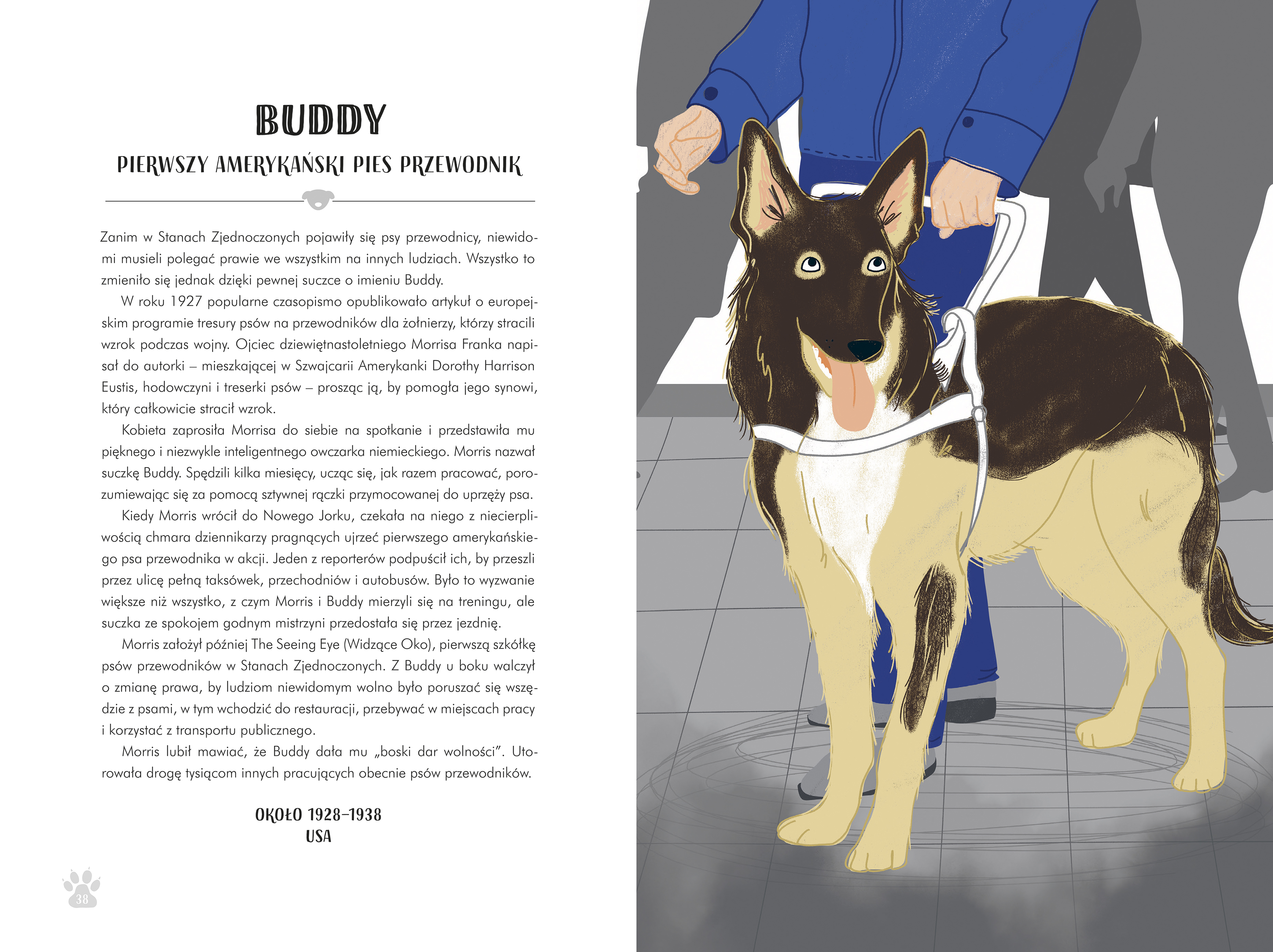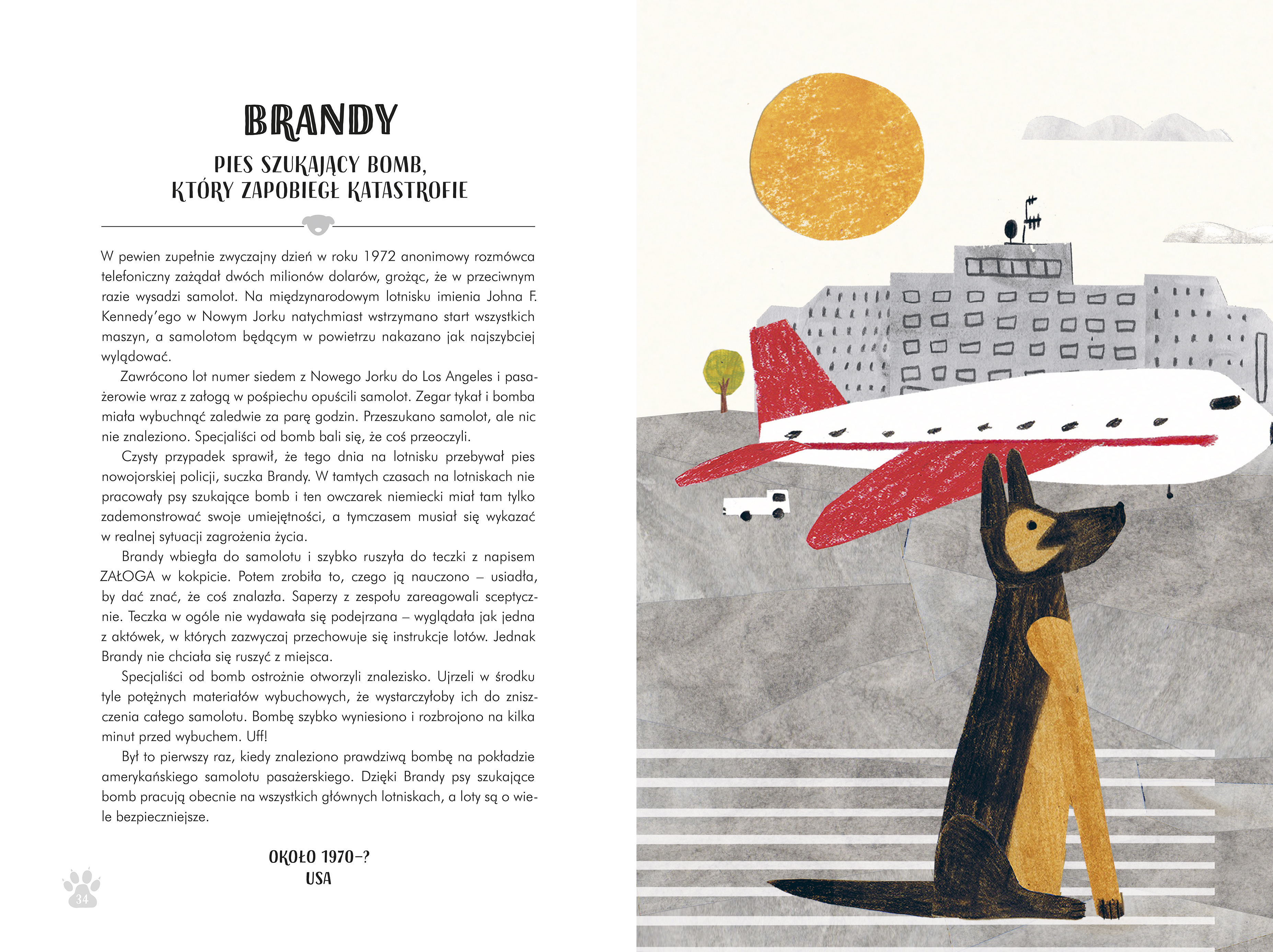 Poznaj historie prawdziwych psich bohaterów, którzy przyłożyli łapę do tego, by świat był lepszy. Jak tego dokonali? Antis, psi lotnik, towarzyszył żołnierzom na pokładzie samolotów w trakcie drugiej wojny światowej. Suczka Oddball opiekowała się pingwinami w Australii. Trakr, niezłomny owczarek niemiecki, ratował ocalałych pod gruzami World Trade Center. A urocza i harda Fortune tak bardzo podpadła samemu Napoleonowi, że aż chciał się jej pozbyć. Przygotuj się na moc faktów i bohaterskich wyczynów, od których aż sierść się jeży! Kudłata i rozszczekana lektura dla wszystkich, którzy mają bzika na punkcie psów. Powyższy opis pochodzi od wydawcy. Recenzje:✖ Opinia niepotwierdzona zakupem