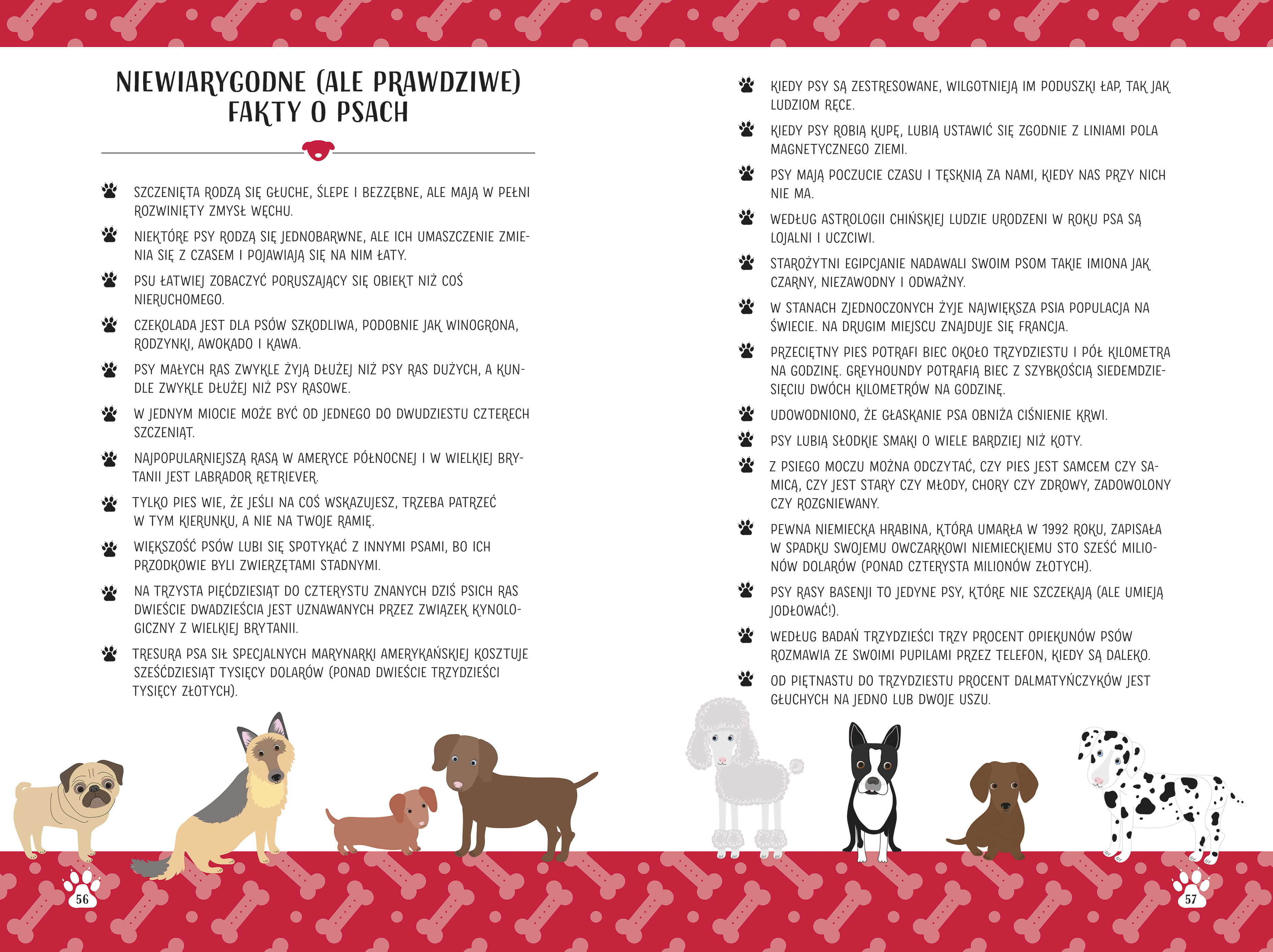 Psy potrafią nas ludzi zadziwiać. Czytając tę książkę zdziwienie pojawiało się niejednokrotnie. I trzeba przyznać jedno psy potrafią zaimponować odwagą, determinacją, wiernością, umiejętnościami jakie są w stanie posiąść. W tej książce opisano liczne przykłady bohaterstwa psów, nawet poświęcenia w celu ratowania człowieka. Psy uczestniczyły w wojnach, były bohaterami wojennymi, poszukiwały bomb, brały i biorą udział w akcjach ratowniczych, wyszukiwały ludzi i zwierzęta pod gruzami, latały w kosmos. Są doskonałymi terapeutami, przewodnikami, były pod Everestem, były na biegunach ziemi, potrafią być niesamowicie sprawne, pokonywać tysiące kilometrów, niektóre potrafią wyczuć komórki rakowe, pomagać ludziom o różnych schorzeniach. Wielu monarchów, władców, prezydentów miało swoich psich ulubieńców, niektóre rody królewskie miały swoje ulubione rasy. Psy to również pomocnicy naukowców, obiekty badań, eksperymentów, wykonawcy różnych „zawodów”, bohaterowie reklam, filmów, książek, gwiazdy Internetu. Psy to również z naszej perspektywy czasem tacy dziwacy, których zachowania nas zaskakują, a czasem nawet brzydzą. Niektóre psy zaskakują swoją wyjątkową inteligencją, potrafią pomagać w poszukiwaniu skarbów, zbierać datki. Z tych wszystkich powodów i dla wielu innych psich ciekawostek warto sięgnąć po tę książkę.