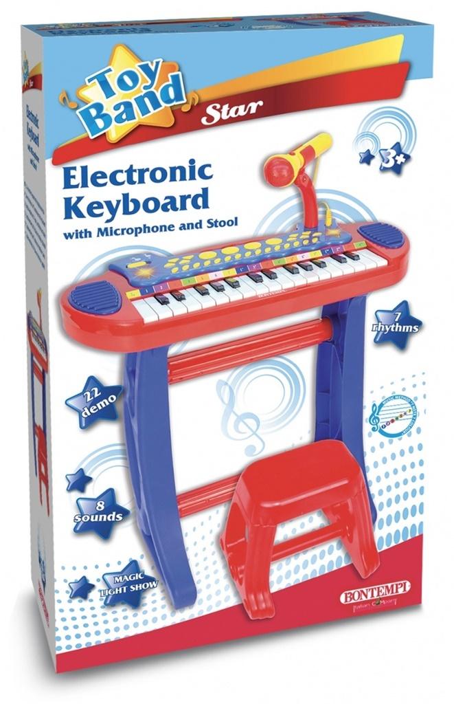 Organy elektroniczne włoskiej firmy Bontempi. Instrumentu zawiera: 31 klawiszy, 8 dźwięków, 7 rytmów, 4 pady perkusyjne, 22 melodie, funkcję nagrywana i odtwarzania, regulację głośności oraz tempa, funkcję automatycznego wyłączania, stołek, mikrofon oraz statyw. Wymiary produktu 45 x 48 x 65cm. Zasilanie 4xR6/AA 1,5V (nie dołączono do zestawu).