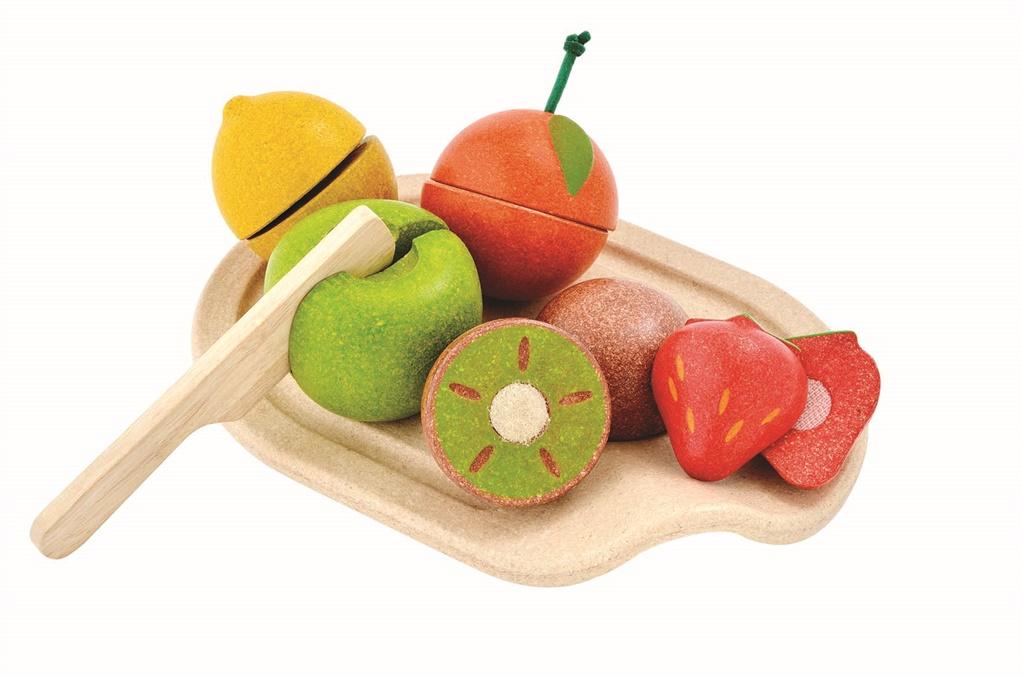 Zestaw smakowitych owoców z nożykiem i deską do krojenia. Pomarańcza, cytryna, kiwi, jabłko i truskawka mają w środku rzep, dzięki któremu można je kroić na pół i z powrotem składać w całość.