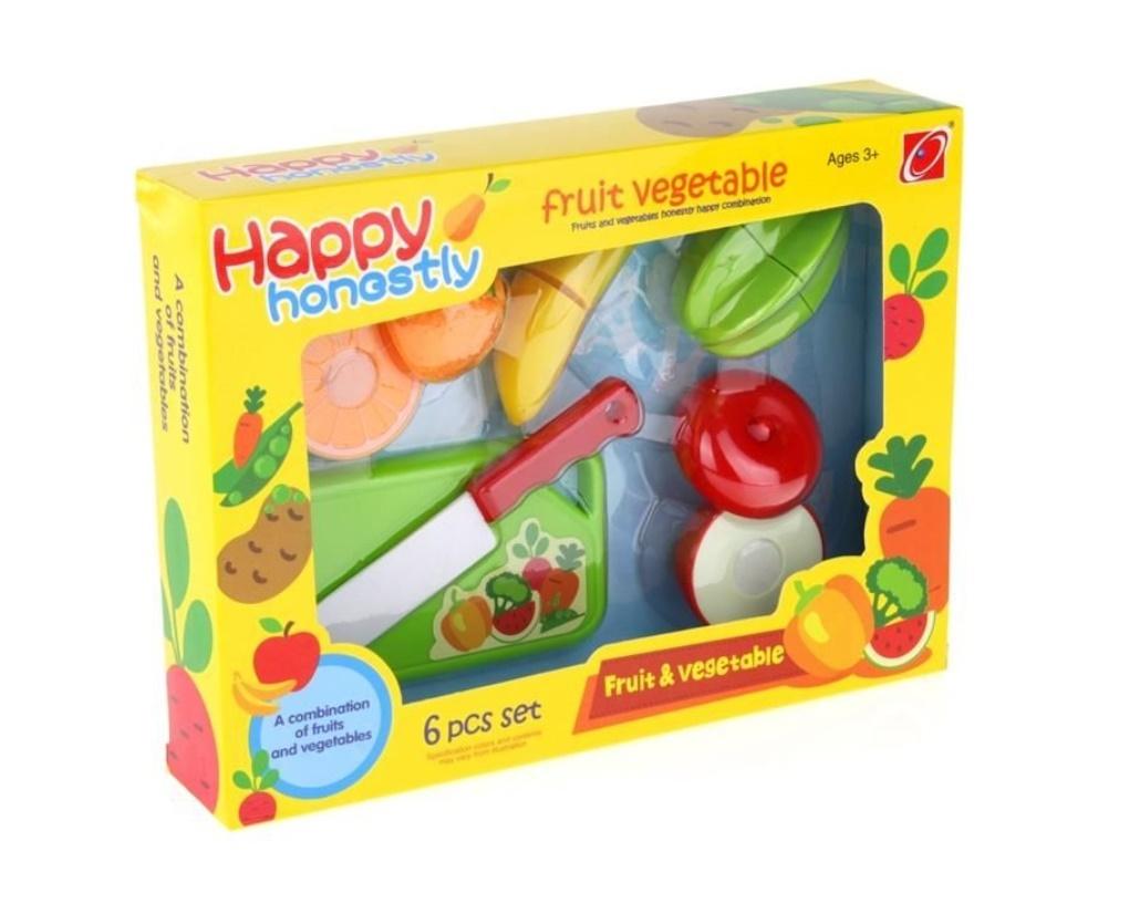 W zestawie znajduje się 6 elementów: - owoce, składające się z 2 połówek: banan, pomarańcza, jabłko, karambola - deska do krojenia (13 x 7,5 cm) - nóż (14,5 cm) x