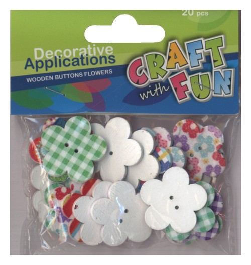 Zestaw 20 drewnianych guzików w kształcie kwiatów.
