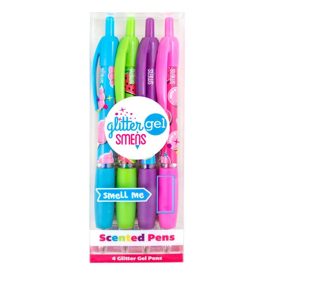 Opakowanie Pachnących Długopisów Smens zawiera 4 długopisy w różnych kolorach i zapachach: różowy - guma balonowa, fioletowy - babeczka, niebieski - wata cukrowa, zielony - arbuz. Żelowy i brokatowy tusz. Pachnąca oprawka długopisów. Zapach utrzymuje się dwa lata.