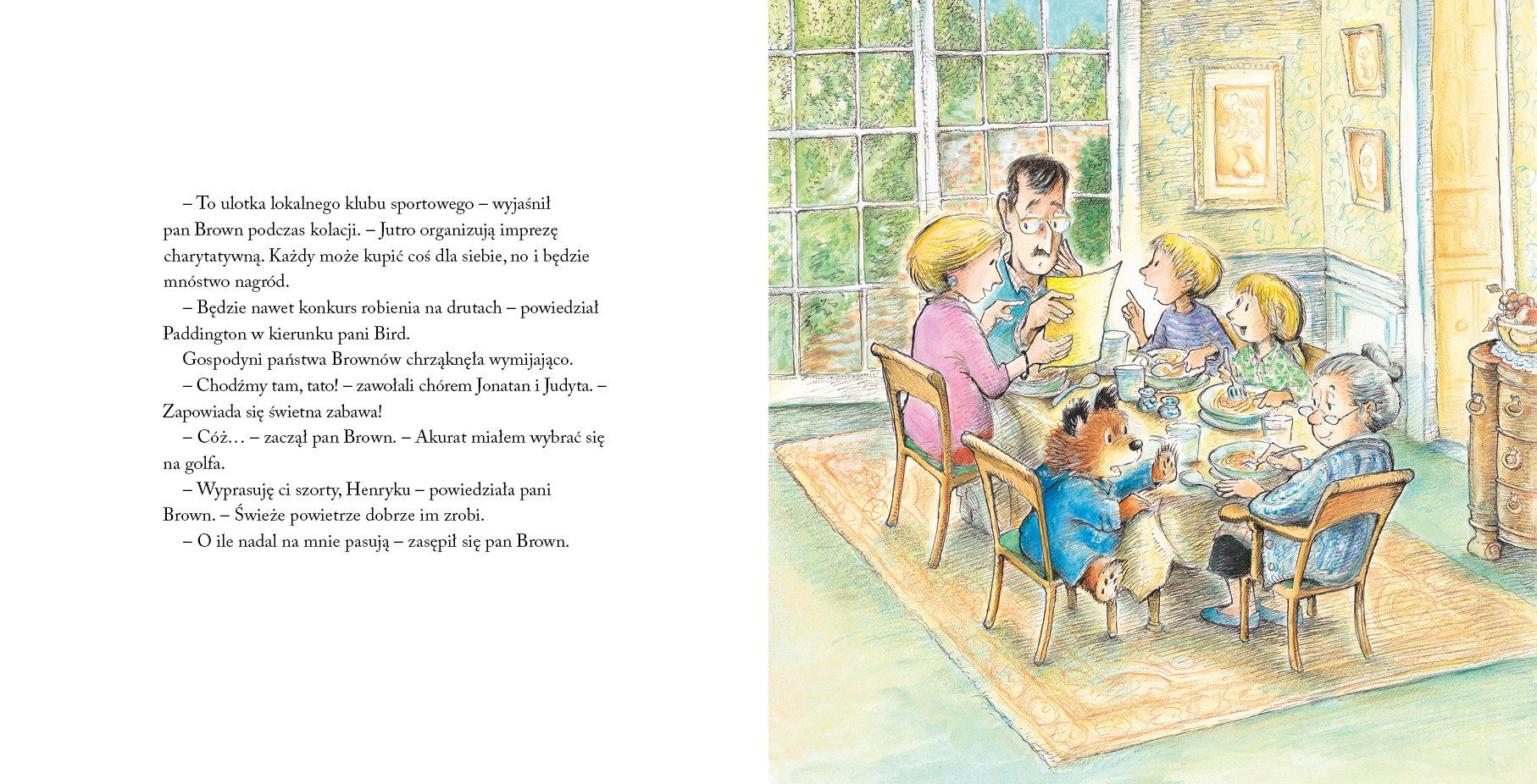 W książce Michaela Bonda "Paddington idzie po złoto" do łapek naszego niedźwiadka trafia ulotka informacyjna. Dwa zdania tak przykuły jego uwagę, że zamiast wrzucić ją do kosza, przekazuje w ręce pana Browna. Szybko okazuje się, że to bezpłatne zaproszenie na imprezę charytatywną. Cała rodzina Brownów postanawia wziąć w niej udział, licząc na to, że uda im się zdobyć nagrody w rozlicznych konkurencjach. Nie przewidzieli jednego, choć życie nie raz już dało im sygnał ostrzegawczy: gdzie jest Paddington tam jest i katastrofa. Jak skończy się udział rodziny Brownów w zawodach? Czy Paddington zdobędzie złoty medal? I co tak naprawdę się liczy? Odpowiedź znajdziecie na kartach książki. Mądra to i wartościowa czytanka, wypełniona charakterystycznymi, cudownymi ilustracjami za którymi stoi R.W Alley. Nieustająco polecam ją waszej czytelniczej uwadze! x