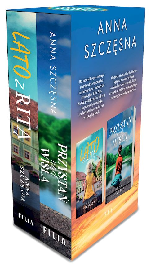 Najniższa cena z ostatnich 30 dni: 48,08 zł Opis produktuZasady bezpieczeństwaLato z Ritą: Do niewielkiego, sennego miasteczka wprowadza się tajemnicza i niezwykle atrakcyjna Rita Plat. Swoim pojawieniem się wzbudza zainteresowanie mieszkańców. Plotki, podejrzenia i sekrety rozgrzewają niewielką społeczność nie mniej niż wakacyjny upał. Czyżby trzymająca się na uboczu Rita miała z tym coś wspólnego? Lekka powieść idealna na lato! Przystań nad Wisłą: Tamara Pawlicka ma za sobą trudne dzieciństwo. Opuszcza Warszawę i wyrusza do tajemniczego domu położonego na skarpie. Tamara chce odciąć się od dotychczasowego życia i zacząć od nowa, ale tajemnice z przeszłości nie dają o sobie zapomnieć. Inspirująca historia o tym, jak dzieciństwo wpływa na nasze wybory w dorosłości, ale też o sile, która drzemie w każdym z nas i pomaga zawalczyć o spełnienie marzeń. x