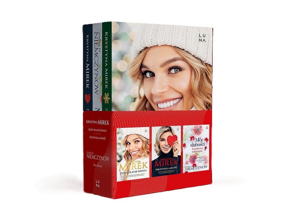Opis produktuZasady bezpieczeństwaNa magiczny czas świąt polecamy wyjątkowy pakiet książek - do śmiechu, i do wzruszeń. Lekkie, ciepłe i przyjemne powieści Krystyny Mirek: "Niezwykła miłość" i "Złoty płatek śniegu" sprawiają, że czyta się je z uśmiechem na twarzy. To poruszające historie o miłości, w których rozum walczy z sercem o pierwszeństwo w dokonaniu decyzji, a skrywane tajemnice potrafią nieźle namieszać. Natomiast "Moc słabości" Anny H. Niemczynow, piętnaście opowieści z wątkami biograficznymi, to pełna mądrości życiowych, pokrzepiająca treść, która motywuje, inspiruje, uczy wdzięczności i pokazuje, skąd brać siły duchowe, by mimo przeciwności mieć szczęśliwe i dobre życie. x