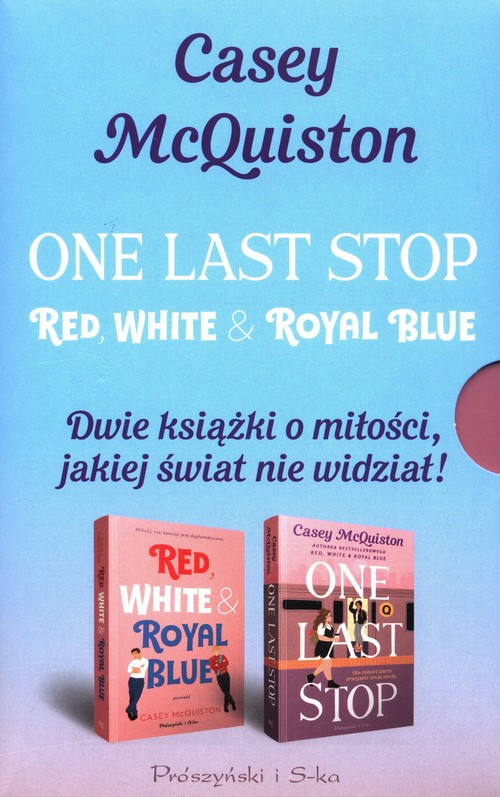 Na brytyjskim dworze wybucha skandal: książę Henry i Alex syn prezydentki USA w wyniku kłótni lądują w środku weselnego tortu. Aby zażegnać kryzys, mężczyźni będą musieli udowodnić mediom, że łączy ich przyjaźń. Nikt nie spodziewa się, że przerodzi się ona w uczucie, które będą musieli ukrywać przed światem. Teraz pora na ONE LAST STOP zachwycającą historię o uczuciu, które potrafi pokonać nawet granice czasu. Dla introwertycznej August przeprowadzka do Nowego Jorku to szansa na odcięcie się od przeszłości. Wystarczy jednak jedna podróż metrem, by w jej życiu pojawiła się tajemnicza Jane. Problem pojawia się, gdy August odkrywa, że obiekt jej westchnień to tak naprawdę zagubiona w czasie podróżniczka Dwie historie. Dwie pary. Dwa różne światy. Jedno uczucie, wiele przeszkód i mnóstwo wspaniałej rozrywki dla zakochanych we wzruszających opowieściach o ludziach odkrywających miłość i prawdę o samych siebie. Biogram autora: Casey McQuiston to prawdziwie queerowa autorka* pisząca książki o mądrych ludziach, którzy zakochują się nie w tym, w kim trzeba. Urodzona i wychowana w południowej Luizjanie, obecnie mieszka w Nowym Jorku. Towarzyszem jej życia jest Pepper, pudel na etacie osobistego asystenta. *Casey jest osobą niebinarną używa wszystkich zaimków. x