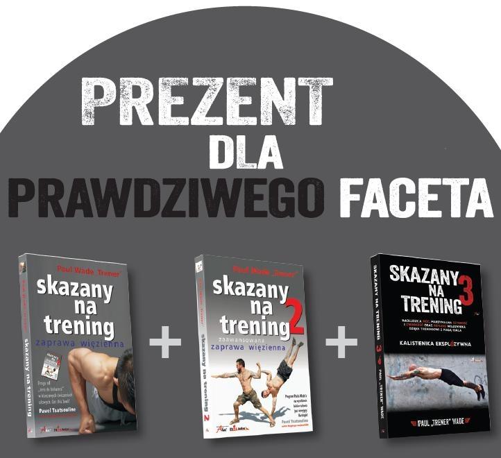 Opis produktuZasady bezpieczeństwaSkazany na trening – pakiet 3 tomów Kultowy podręcznik progresywnego treningu z masą ciała – opracowany w wyjątkowych okolicznościach: przez byłego więźnia z USA, który w latach odosobnienia poznawał tajniki ćwiczeń fizycznych, przekazywanych z pokolenia na pokolenie więźniów, a zakorzenionych w tradycji tzw. złotego wieku kulturystyki. „W pewnym momencie, będąc za kratkami, postawiłem sobie za cel, by wiedzieć o dawnych ćwiczeniach siłowych więcej niż ktokolwiek inny z żyjących. W ciągu lat zgromadziłem całe stosy notatek. Wybrałem najlepsze pomysły i techniki ze wszystkich systemów, które poznałem, by opracować doskonałą formę kalisteniki – metodę, którą można stosować progresywnie w celu zdobycia tytanicznej siły, zwinności i kondycji; metodę, której stosowanie nie jest uzależnione od dostępu do wyrafinowanego sprzętu, która zabiera minimum czasu i jest jak najmniej skomplikowana.” • Tom 1 – podstawy treningu siłowego na bazie progresji sześciu niewyrafinowanych ćwiczeń (pompki, przysiady, wznosy nóg, podciągnięcia itp.), prowadzących do podciągnięć na jednej ręce czy pompek w staniu na rękach… • Tom 2 – trening obszarów drugoplanowych, który jest konieczny do budowy pełnej sprawności siłowej, m.in. łańcuch boczny mięśni tułowia, mięśnie skośne i poprzeczny brzucha, siła dłoni i przedramion, łydki, postępowanie w razie kontuzji. • Tom 3 – kalistenika eksplozywna, czyli umiejętność poruszania swoim ciałem z szybkością i zwinnością: salto w przód i tył, przerzuty, ćwiczenia na drążku, elementy akrobatyki x