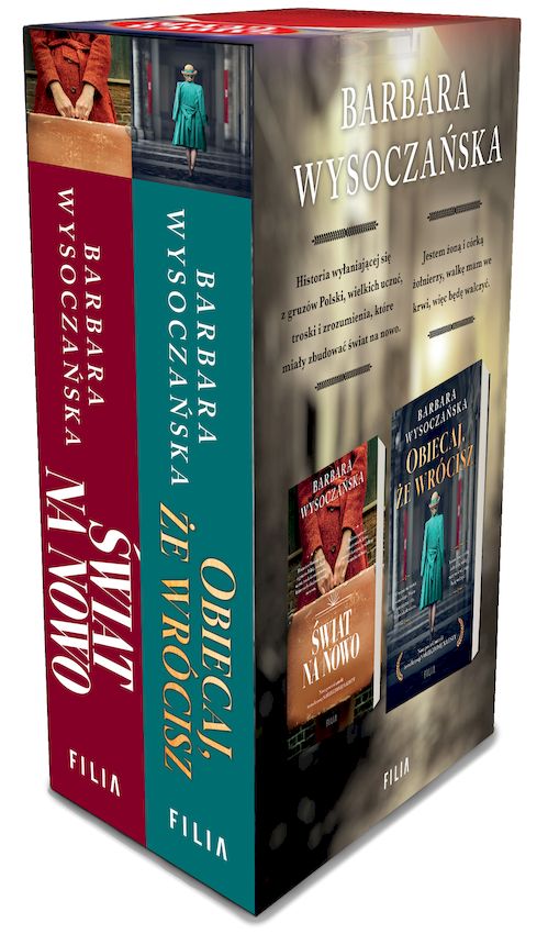 Opis produktuZasady bezpieczeństwaBestsellerowe powieści historyczne, które na długo pozostają w pamięci! "Świat na nowo" Kończy się II Wojna Światowa, a w Polsce zaczyna się czas powojennej odbudowy i podnoszenia kraju z gruzów. Piękna opowieść o niespełnionych marzeniach, które zniweczyła wojna, o demonach przeszłości, o samotności i o wielkiej potrzebie miłości. Historia wyłaniającej się z gruzów Polski, wielkich uczuć, troski i zrozumienia, które miały zbudować świat na nowo. "Obiecaj, że wrócisz" W rzeczywistości wojennej okupacji, młoda żona polskiego oficera Karolina Kornacka zamieszkuje u teściów i czeka na powrót męża z obozu jenieckiego z ZSRR. Codzienność Kornackich zmienia się wraz z przejęciem ich domu przez oficera SS Friedricha Webera i jego żony Leni. Tymczasem Niemcy odnajdują w lasku katyńskim tysiące zwłok polskich jeńców. x
