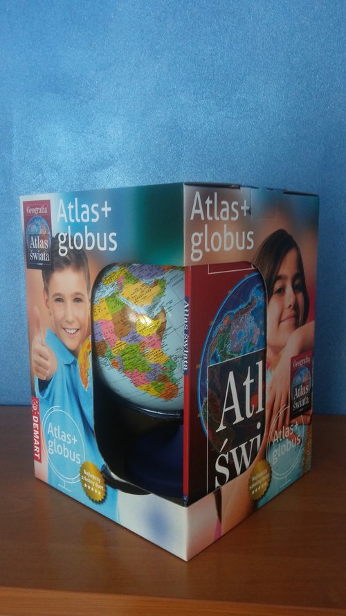 Pakiet stanowi globus z podziałem politycznym o średnicy 22 cm i Atlas świata z rozbudowaną częścią poświęconą Polsce. Atlas i globus w jednym pakiecie dają możliwość zarówno pokazania bogatej informacji rozmieszczonej przestrzennie na mapach w większych skalach na mniejszym obszarze, jak i poprawnego przedstawienia obrazu całego świata na kulistym globusie w skali 1 : 60 000 000. Świetnie się więc uzupełniają. x
