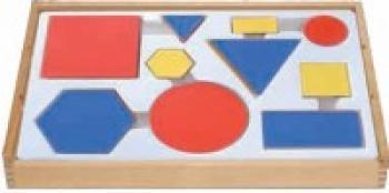 Dziecko rozwiązuje zadania poprzez umieszczenie drewnianych klocków w odpowiednich nacięciach na palecie. Strony kontrolne tarcz pozwalają dziecku sprawdzić poprawność wykonanych zadań.