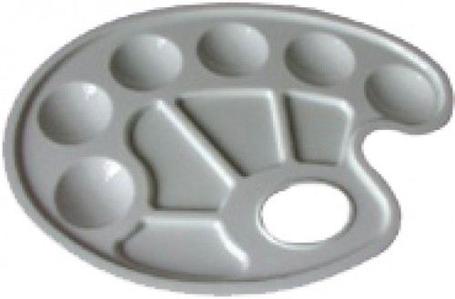 Paleta malarska wykonana z tworzywa. Jest przeznaczona do farb wodorozcieńczalnych. Posiada dziesięć płytkich pojemników na farby oraz otwór do trzymania.