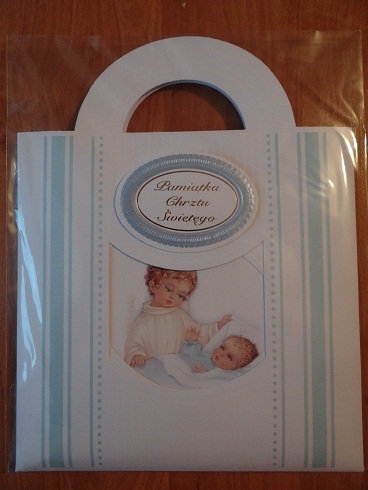 ""Album Torebka"" Oryginalna pamiątka przeznaczona na Chrzest Święty. Jedyny na rynku albumik z torebką w komplecie. Torebka zdobiona tłoczeniem oraz perłową folią tłoczoną na gorąco. Wycięcie ukazuje wzór albumu co w połączeniu z dopasowanym kolorystycznie wzorem torebki tworzy niepowtarzalną całość. Książeczka zawiera sentencje, myśli oraz modlitwy związane z uroczystością Chrztu Świętego. Jest tu także miejsce na wpisanie informacji o miejscu, dacie Chrztu Świętego oraz Rodzicach Chrzestnych.