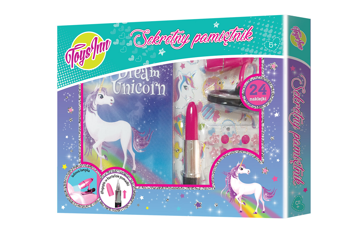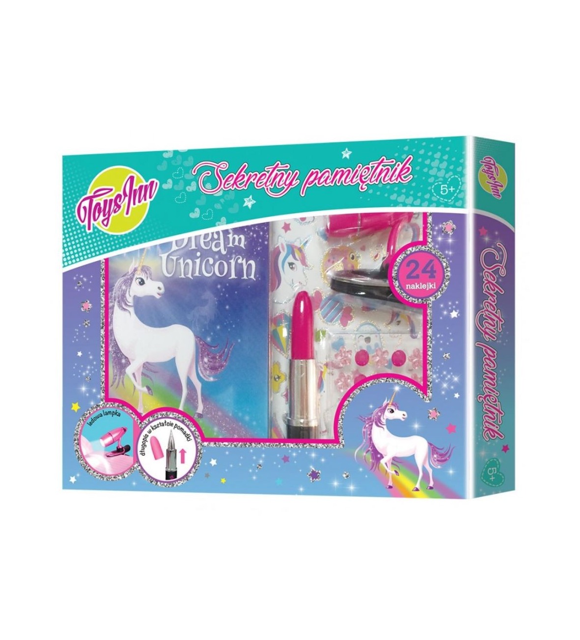 Zawartość – pamiętnik, lampka ledowa, dżety, naklejki, długopis w kształcie pomadki.