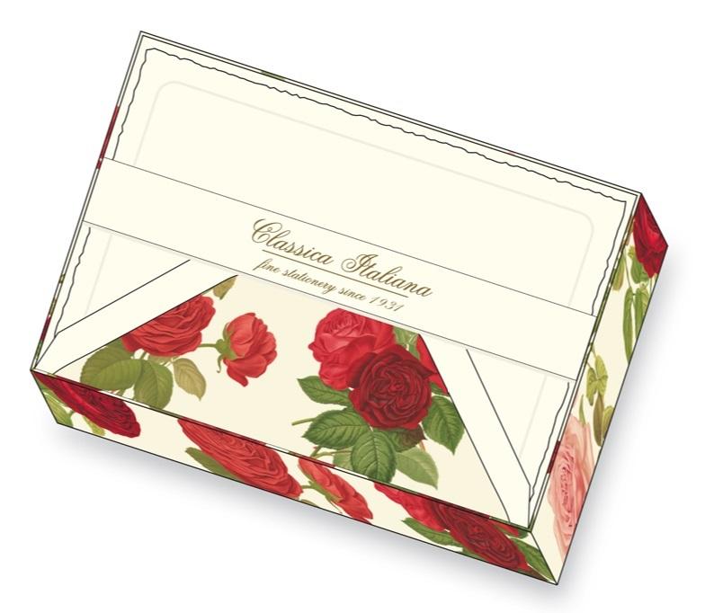 Papeteria w ozdobnym pudełku, papier o gramaturze 240g/m2. W zestawie znajduje się 10 kopert i 10 karnetów.
