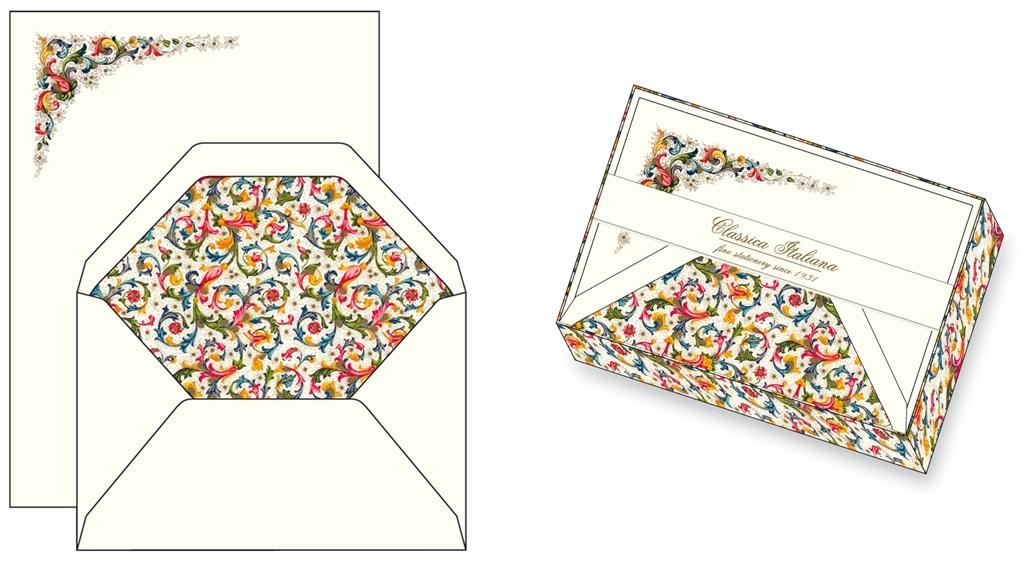 Papeteria w ozdobnym pudełku z przykrywką, koperty posiadają zaznaczoną linię, papier bawełniany o gramaturze 120g/m2. W zestawie znajduje się 10 kopert i 10 papierów listowych. Produkt z ekskluzywnej galanterii wyprodukowany we włoskiej manufakturze.