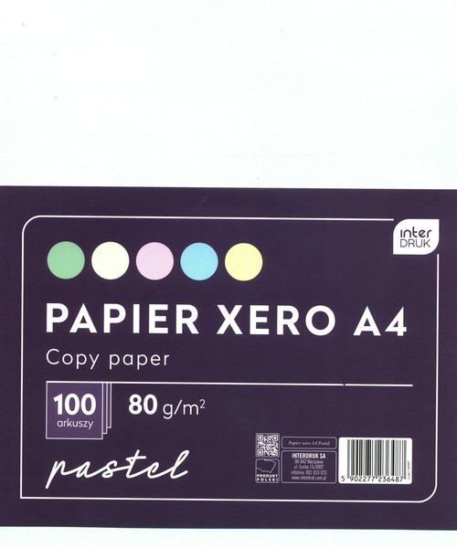 Opis produktuZasady bezpieczeństwaPapier ksero w rozm. A4. 5 pastelowych kolorów po 20 kartek, łącznie 100 arkuszy w ryzie. x
