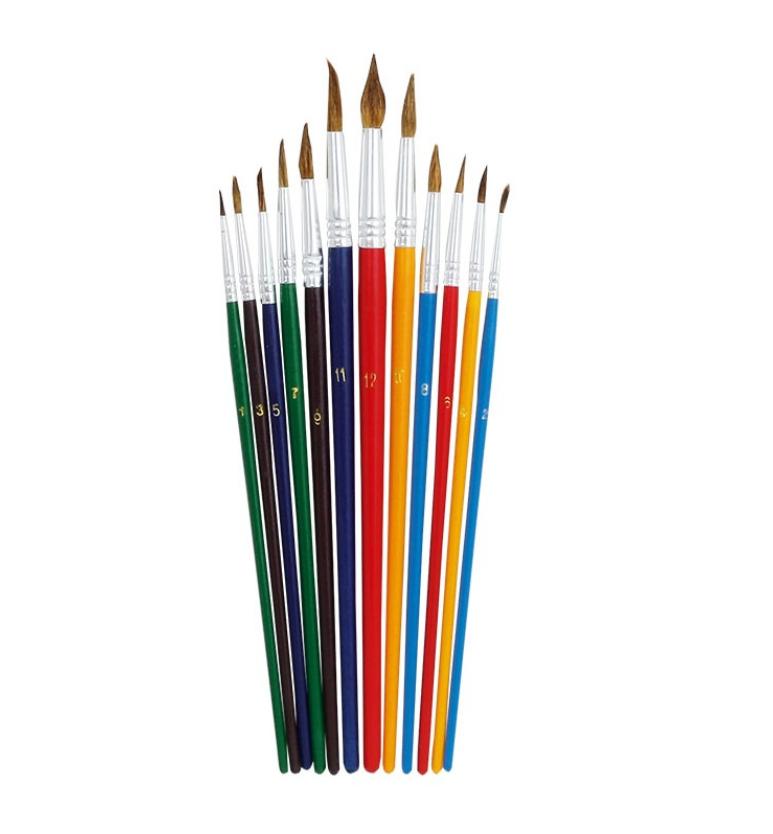 Artystyczne, precyzyjne. Drewniana rękojeść, metalowe okucie, kozie włosie. Opakowanie blister 12szt. Rozmiary: 1, 2, 3, 4, 5, 6, 7, 8, 9, 10, 11, 12.