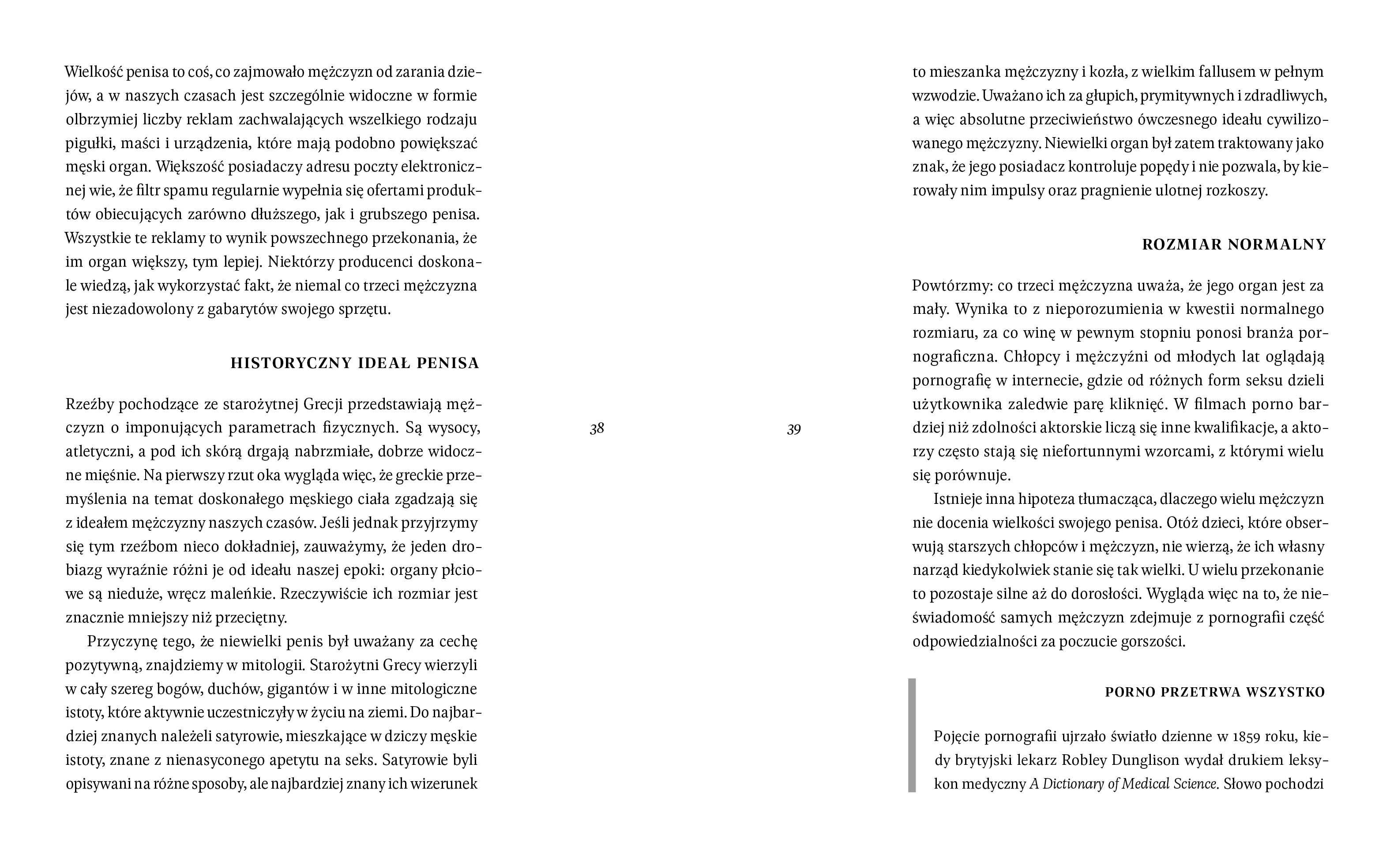 Książka dla wszystkich mężczyzn i tych, którzy ich kochają Gdyby ludzkość poświęcała tyle uwagi Kosmosowi, co problemom z penisem, czytałbyś tę książkę na Marsie. Czas najwyższy, by odrzucić mity i mętne porady doktora Google i stać się świadomym użytkownikiem męskiego sprzętu. Ten przewodnik po męskiej seksualności sprawi, że mężczyźni poczują dumę z własnego ciała. • Czy mężczyźni naprawdę myślą o seksie co siedem sekund? Dlaczego kochankowie zasypiają tuż po orgazmie? Czy potencja ma coś wspólnego z kolarstwem? • Co z tym męskim punktem G? • I wreszcie: czy rozmiar naprawdę ma znaczenie? Sturla Pilskog jest prawdopodobnie najbardziej błyskotliwym urologiem na świecie. W tej książce jasno i logicznie odpowiada na wiele pytań dręczących pacjentów, a po drodze snuje barwne opowieści o starożytnej viagrze, organach amerykańskich prezydentów i pośmiertnych przygodach klejnotu Napoleona. FRAGMENT KSIĄŻKI: Historyczny ideał penisa Rzeźby pochodzące ze starożytnej Grecji przedstawiają mężczyzn o imponujących parametrach fizycznych. Są wysocy, atletyczni, a pod ich skórą drgają nabrzmiałe, dobrze widoczne mięśnie. Na pierwszy rzut oka wygląda więc, że greckie przemyślenia na temat doskonałego męskiego ciała zgadzają się z ideałem mężczyzny naszych czasów. Jeśli jednak przyjrzymy się tym rzeźbom nieco dokładniej, zauważymy, że jeden drobiazg wyraźnie różni je od ideału naszej epoki: organy płciowe są nieduże, wręcz maleńkie. Rzeczywiście ich rozmiar jest znacznie mniejszy niż przeciętny. Przyczynę tego, że niewielki penis był uważany za cechę pozytywną, znajdziemy w mitologii. Starożytni Grecy wierzyli w cały szereg bogów, duchów, gigantów i w inne mitologiczne istoty, które aktywnie uczestniczyły w życiu na ziemi. Do najbardziej znanych należeli satyrowie, mieszkające w dziczy męskie istoty, znane z nienasyconego apetytu na seks. Satyrowie byli opisywani na różne osoby, ale najbardziej znany wizerunek przedstawia istotę będącą mieszanką mężczyzny i kozła, z wielkim fallusem w pełnym wzwodzie. Uważano ich za głupich, prymitywnych i zdradliwych, a więc absolutne przeciwieństwo ówczesnego ideału cywilizowanego mężczyzny. Niewielki organ był zatem uważany za znak, że jego posiadacz kontroluje popędy i nie pozwala, by kierowały nim impulsy oraz pragnienie ulotnej rozkoszy. Rozmiar normalny Powtórzmy: co trzeci mężczyzna uważa, że jego organ jest za mały. Wynika to z nieporozumienia w kwestii normalnego rozmiaru, za co winę w pewnym stopniu ponosi branża pornograficzna. Chłopcy i mężczyźni od młodych lat oglądają pornografię w internecie, gdzie od różnych form seksu dzieli użytkownika zaledwie parę kliknięć. W filmach porno bardziej niż zdolności aktorskie liczą się inne kwalifikacje, a aktorzy często stają się niefortunnymi wzorcami, z którymi wielu się porównuje. Istnieje inna hipoteza tłumacząca, dlaczego wielu mężczyzn nie docenia wielkości swojego penisa. Otóż dzieci, które obserwują starszych chłopców i mężczyzn, nie wierzą, że ich własny narząd kiedykolwiek stanie się tak wielki. U wielu przekonanie to pozostaje silne aż do dorosłości. Wygląda więc na to, że nieświadomość samych mężczyzn zdejmuje z pornografii część odpowiedzialności za poczucie gorszości. Średnia Przeprowadzono różne badania dotyczące wielkości penisa.