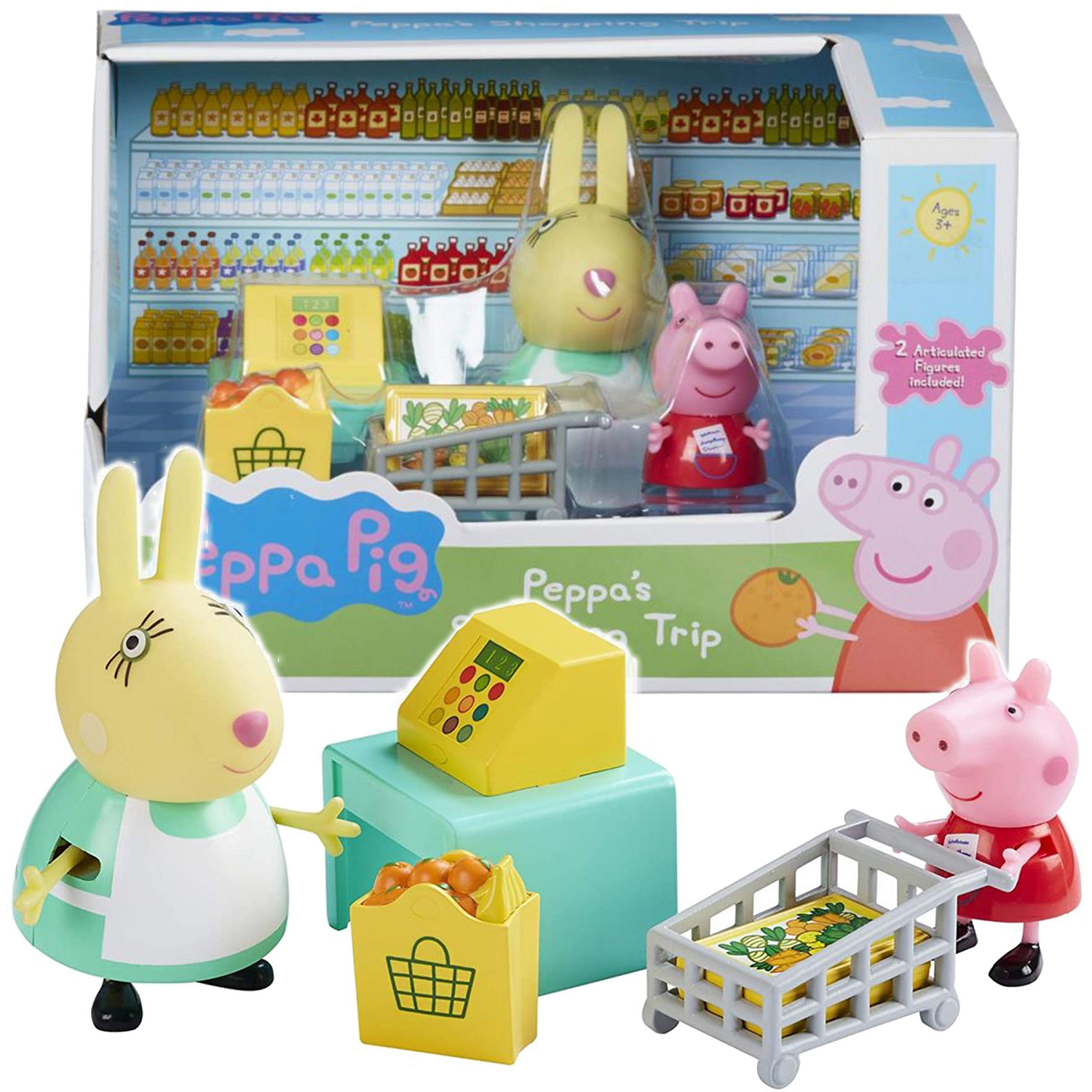 Zawartość i cechy zestawu: 1 figurka - Pani Królik w fartuszku - wysokość ok. 10.5 cm 1 figurka - Świnka Peppa - wysokość ok. 5.5 cm 1 Kasa sklepowa z ladą 1 Wózek na zakupy 1 Torba na zakupy 1 Pudełko akcesoriów spożywczych Ciekawa koncepcja zabawy z możliwością rozbudowy o inne zestawy x