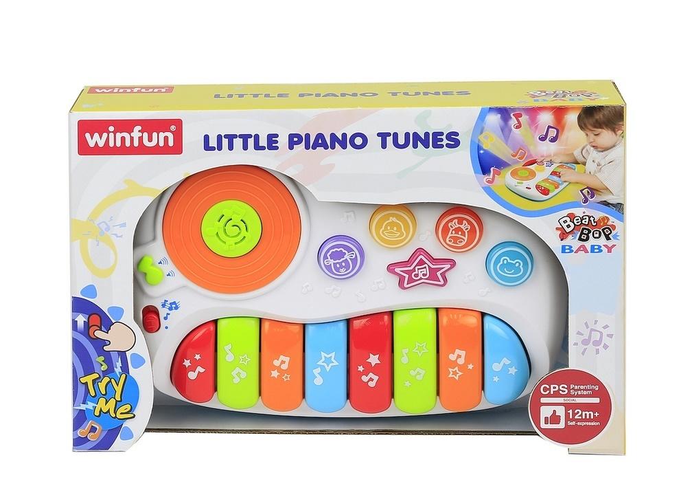 Pianinko to muzyczna zabawka edukacyjna dla każdego malucha. Pianinko posiada osiem przycisków z dźwiękami gamy oraz cztery przyciski funkcyjne z wizerunkami zwierzątek – po naciśnięciu wydają dźwięki imitujące: muczenie, beczenie, gdakanie i kumkanie. Instrument pozwala dziecku na tworzenie pierwszych melodii. Zabawka wyposażona jest w przycisk on/off oraz regulację głośności.