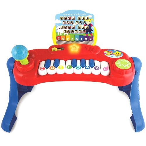 Pianinko ma 8 klawiszy, bębenek do wystukiwania rytmów oraz mikrofon. Wbudowane melodie dodatkowo uatrakcyjnią zabawę.