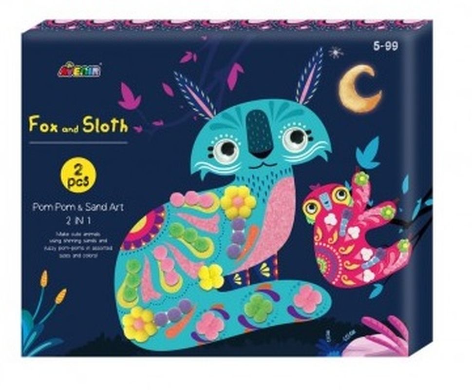 Zestaw dwóch szablonów do ozdobienia puchatymi pomponami - zrób słodkiego lisa i jeszcze słodszego leniwca! Zabawka dla dzieci powyżej 5. roku życia.